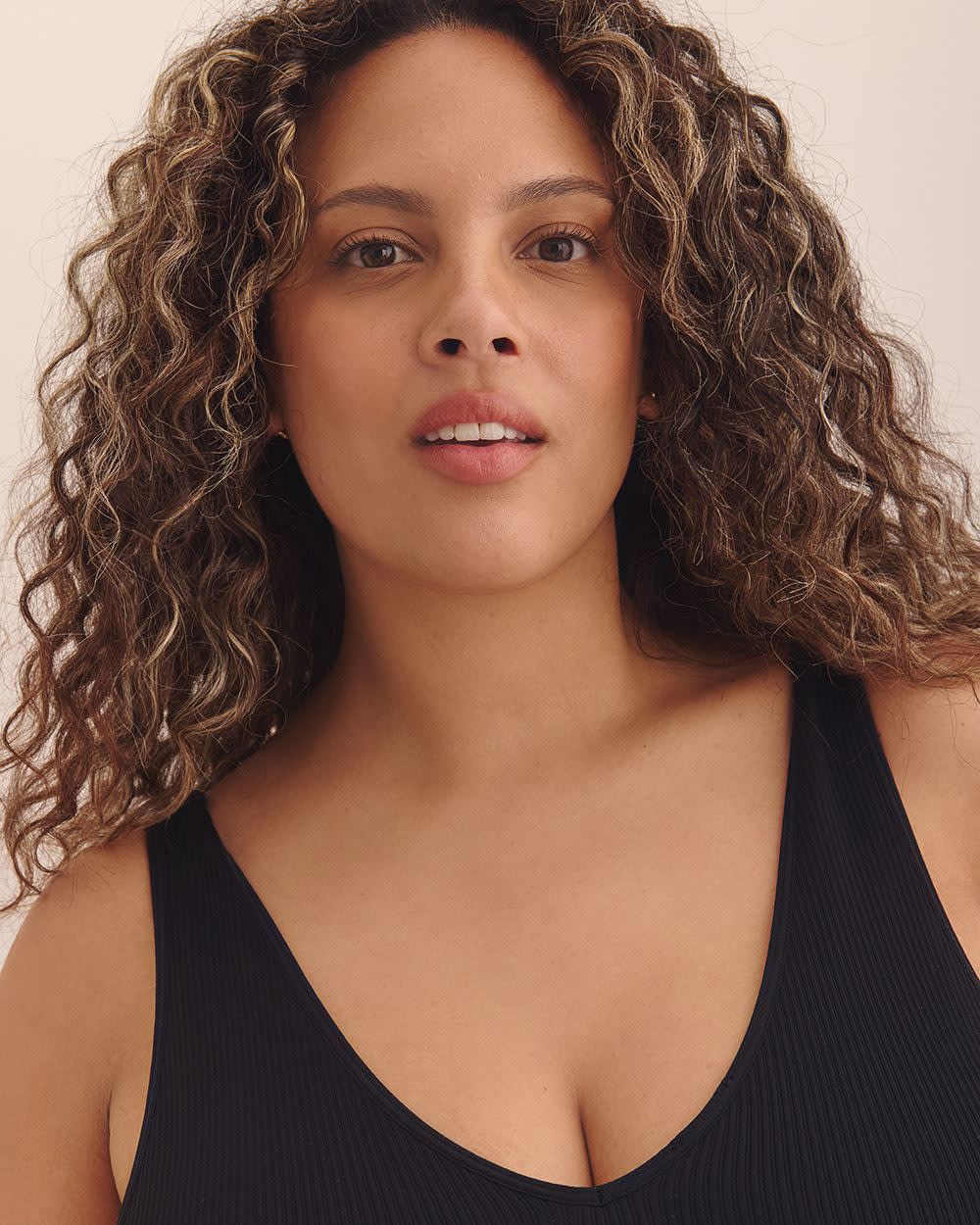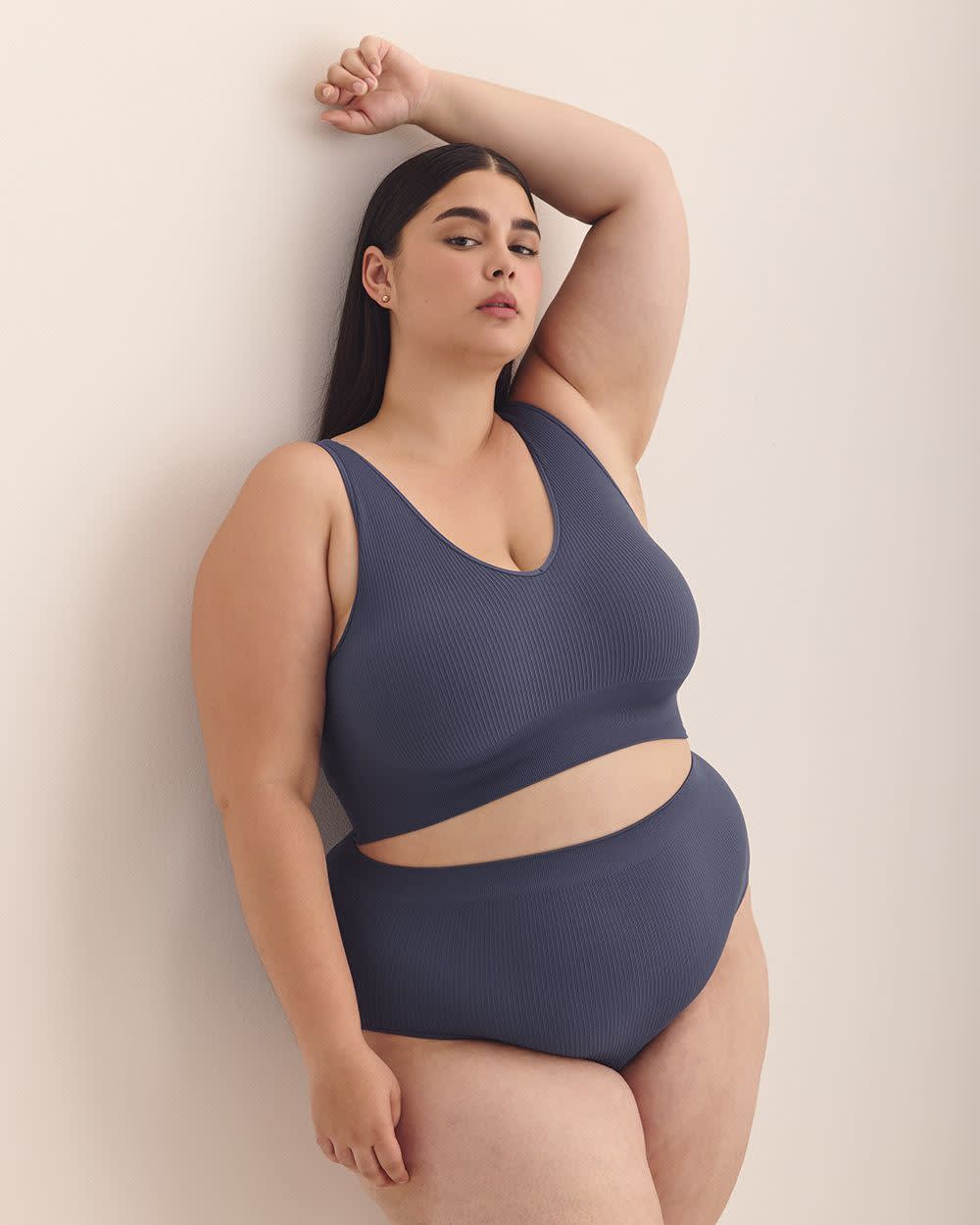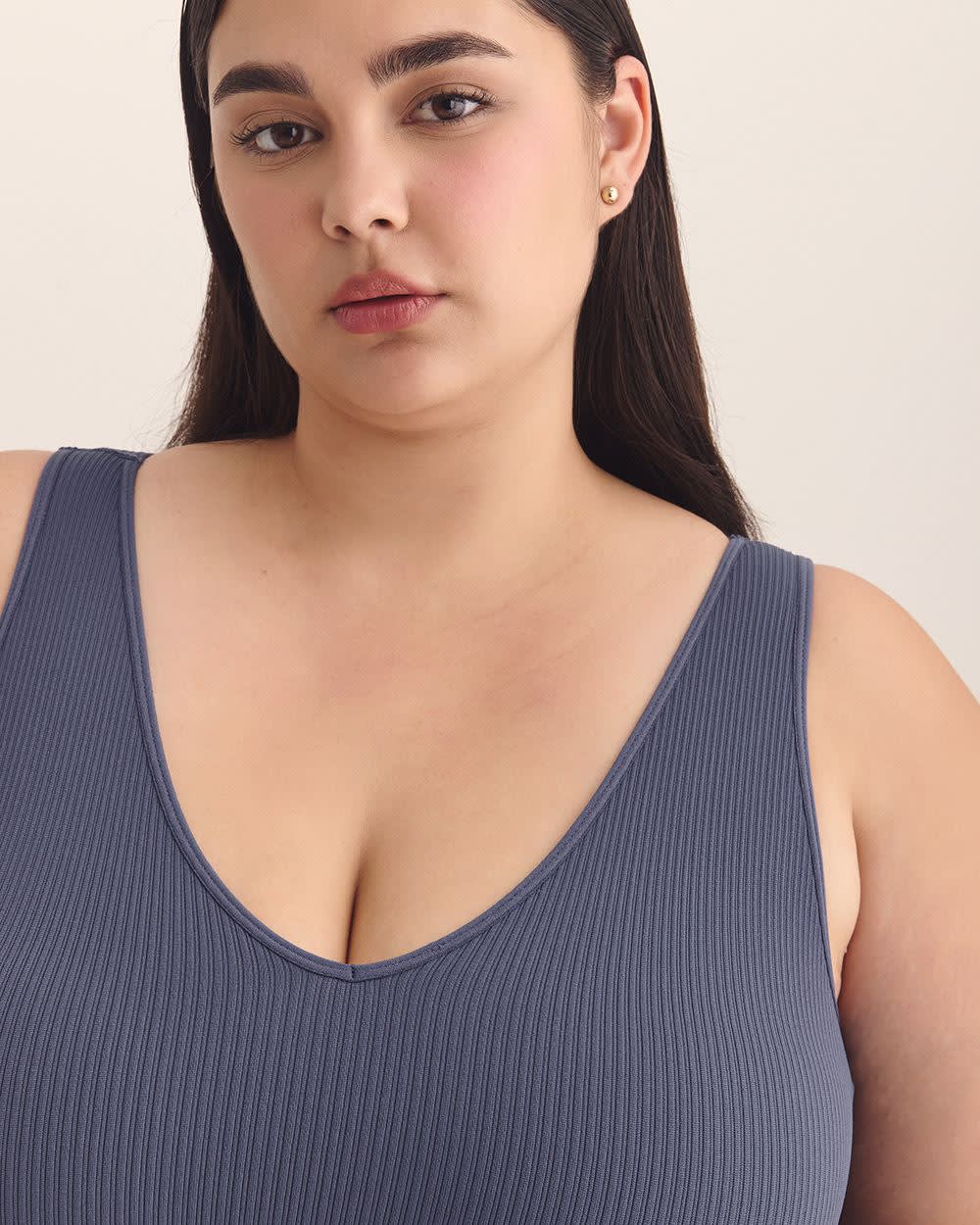 Twice the style, one ultra-comfy fit. This plus-size ribbed knit bralette features a reversible neckline-wear the V-neck or round neck in front depending on your mood. Its seamless design and fold-over elastic make it a smooth, stretchy essential that moves with you, no matter how you wear it.