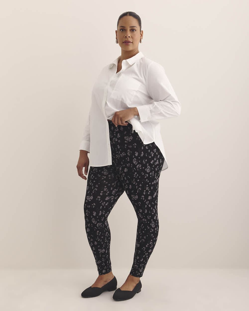 Is there anything more comfortable than a soft pair of leggings? These plus-size fashion leggings are not only the perfect cozy choice, but they also liven up your day-to-day wardrobe with a floral print that pairs just as well with any top for a versatile look. Features - Stretch jersey finish - All-over print - Elastic waistband - Inseam: 27 in Made with EcoCosy(R), a fibre made from certified sustainable wood pulp from sustainably-managed and renewable plantations. Its natural raw materials also means that these fibres are biodegradable.