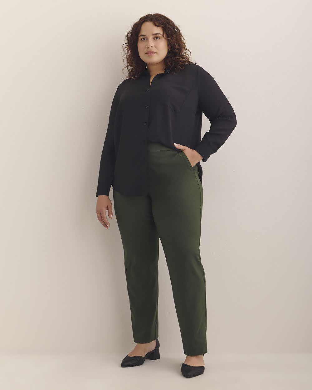 Elevate your workwear wardrobe with this trendy plus-size pull-on pant. Made from a soft and stretchy fabric with a versatile colour, this straight-leg pant will make you feel good and look good. It also offers a universal fit that flatters every figure thanks to its savvy design. Features - Soft-touch woven finish - Solid colour - Straight leg - Savvy pull-on waistband - Functional slanted front pockets - Decorative back welt pockets - Inseam: 31 in
