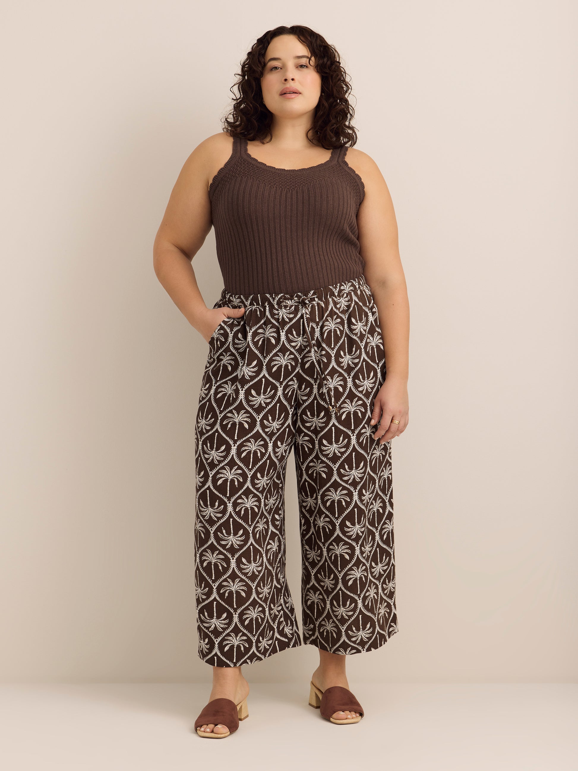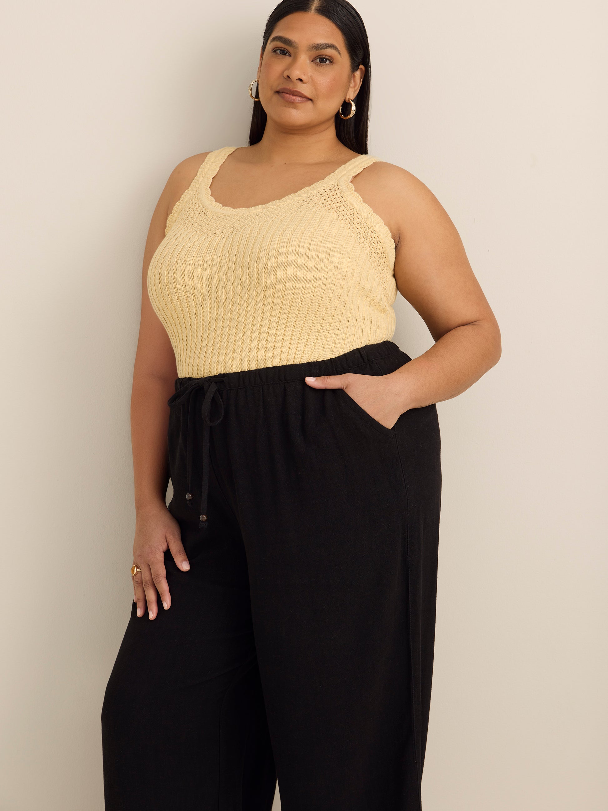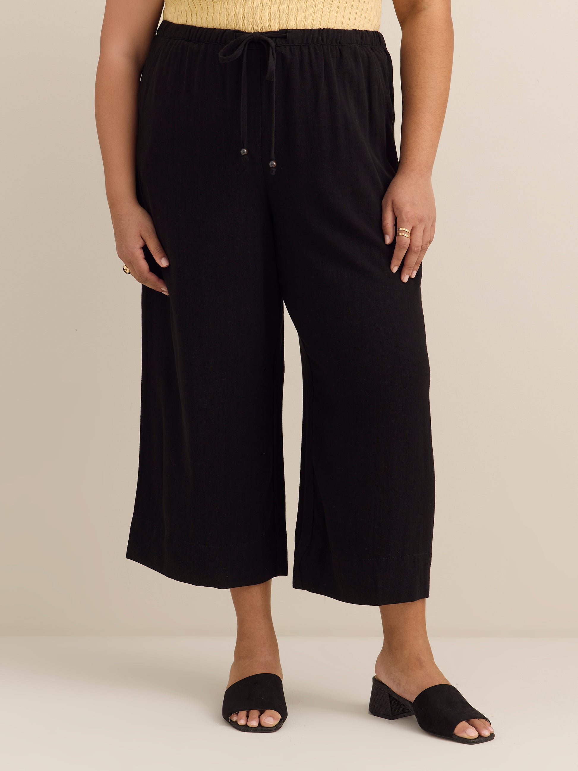 Great fabric, great fit. This plus-size crop wide-leg pant made in a versatile linen blend fabric is a great choice this summer. Featuring a drawstring at the waist for a perfect fit, it is a great bottom to mix and match with your tops for a variety of trendy outfits.