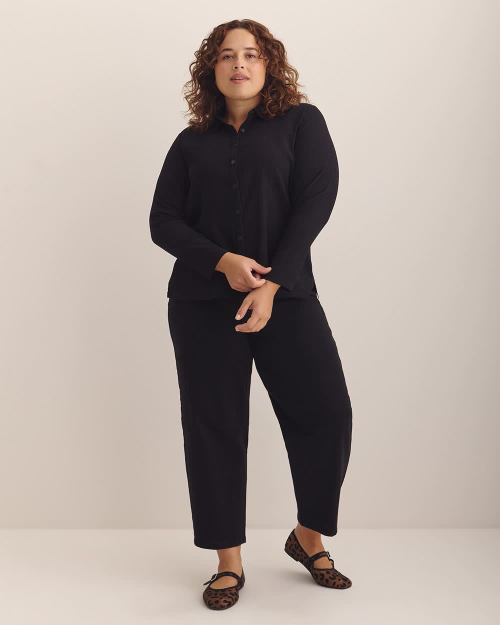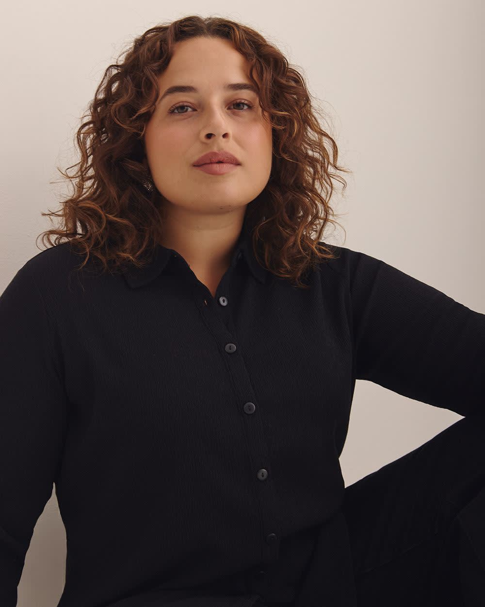 Make any outfit a success with this versatile plus-size buttoned down shirt, featuring a classy shirt collar neckline, and cut in a trendy straight silhouette. Perfect to create any look you want. Plus, its dark textured knit finish makes this top both cozy and sophisticated. Features - Textured knit finish - Solid colour - Long sleeves - Shirt collar - Front button placket - High-low hem - Straight fit - Length: 27 in