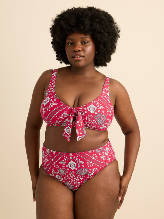 One fabulous swim bottom, two stunning looks! Designed with a bandana print on one side, and a striped pattern print on the other side, you can mix and match this plus-size swim brief with many bikini tops to keep your vacation interestingly stylish. With its smoothing power mesh effect, high rise and cheeky cut, it will be a great addition to your swim collection.