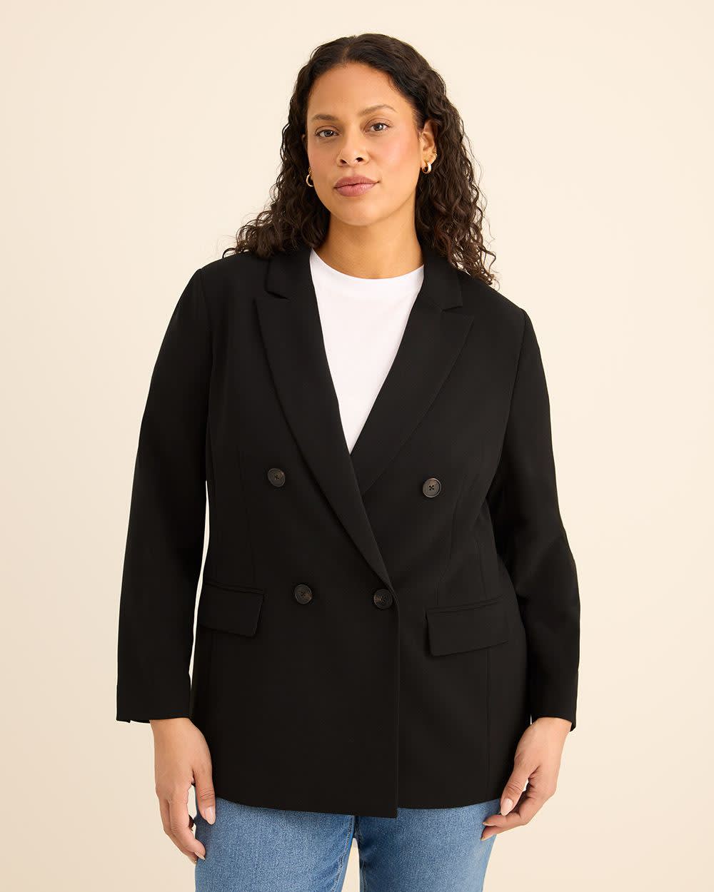 Designed to redefine your style game, this exquisite plus-size blazer provides a rich and sophisticated look. Whether you're pairing it with your favourite denim and a classy top or layering it gracefully over a sleek pencil skirt, this black double-breasted blazer effortlessly captures the essence of chic professionalism while keeping you cozy and comfortable at all times.