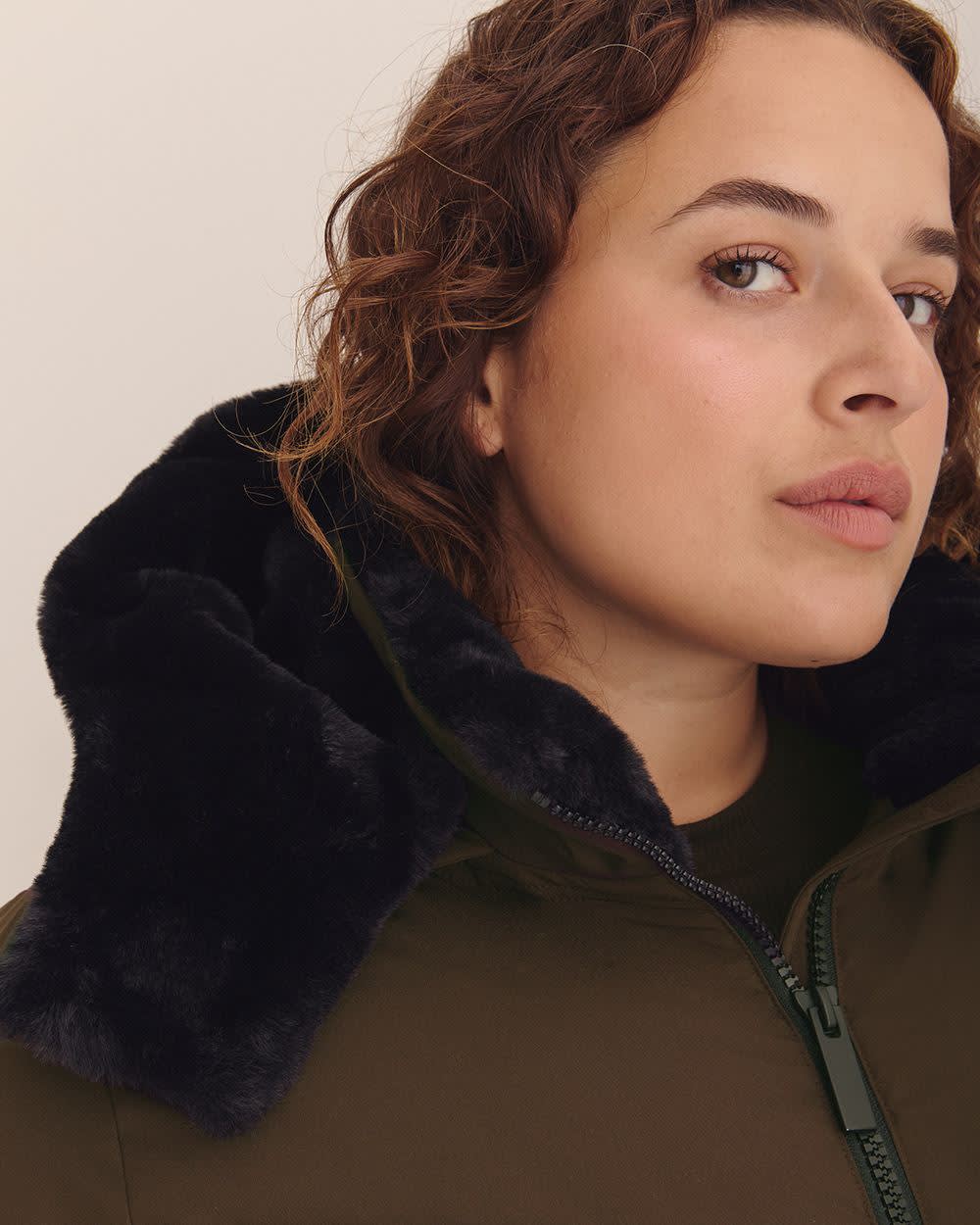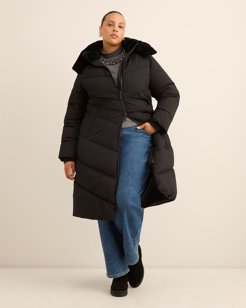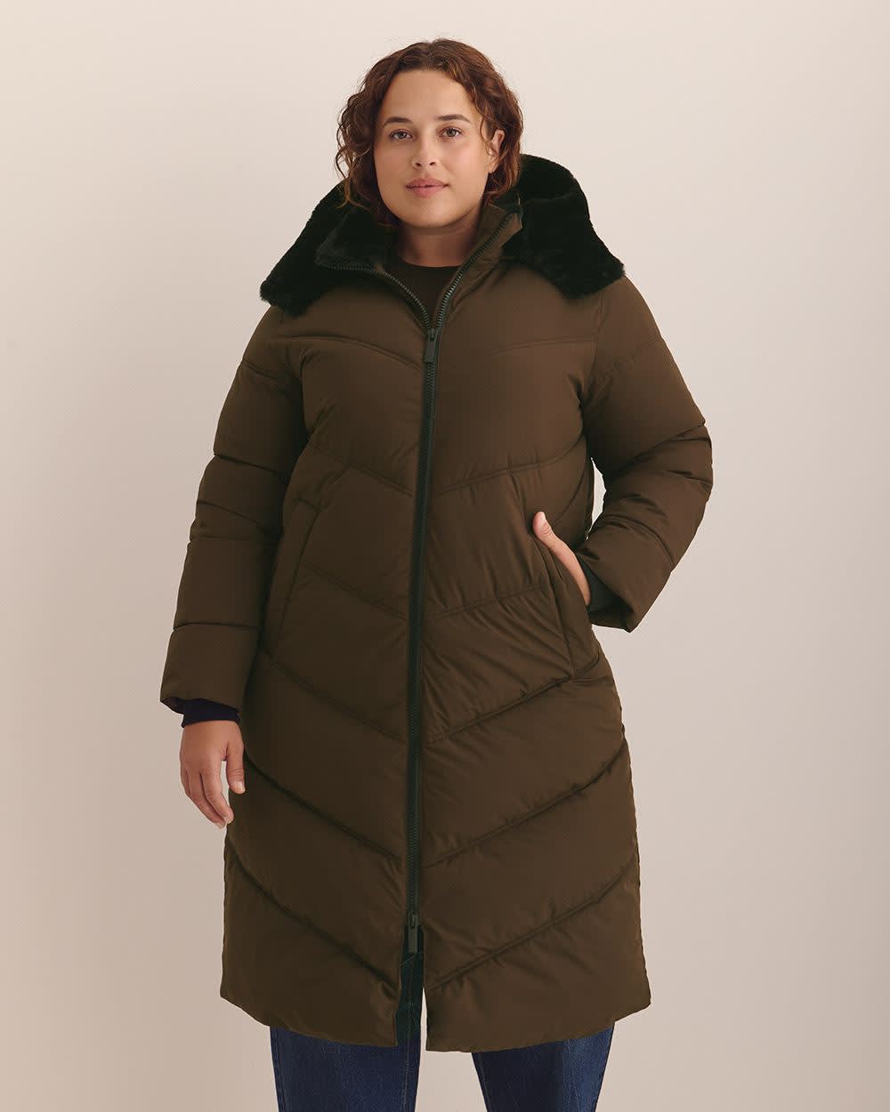 So warm and comfy, this plus-size puffer coat will keep the shivers away this season. Made of a chevron quilted finish, with a removable fur-lined hood, and a maxi length, this puffer jacket has you covered. Features - Chevron quilted finish - Solid colour - Recycled faux down - Removable and adjustable hood - 2-way front zipper closure - Front zipper pockets - Faux fur lining at hood and collar - Ribbed cuffs - Water repellent - Length: maxi Made with recycled polyester containing reprocessed polyester, plastic bottles, or a mix of fabric waste and bottles.