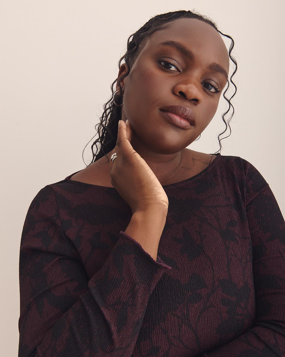 This plus-size boat-neck knit top is the ultimate everyday wear with its classic features and feminine lettuce-edge sleeves. Plus it's the perfect undershirt to highlight your favorite sweater, blazer or vest when temperatures drop.