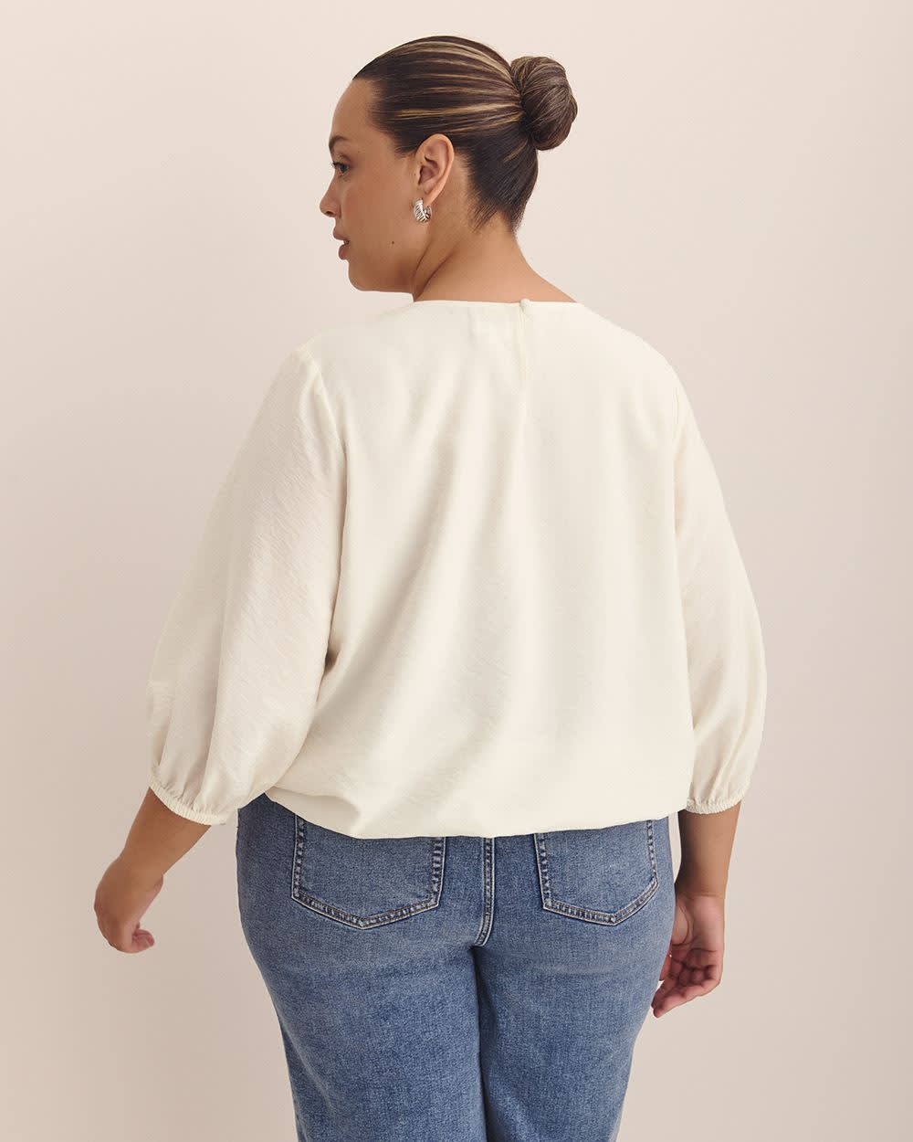 Playful and polished, this plus-size bubble-hem blouse adds volume and charm to your outfit. With its flowy woven finish, balloon sleeves, and unique bubble hem, it's perfect for pairing with high-rise bottoms. Features - Flowy woven finish - Balloon sleeves - Crewneck with shirring - Bubble hem - Elastic cuffs - Back keyhole - Length: 25 in