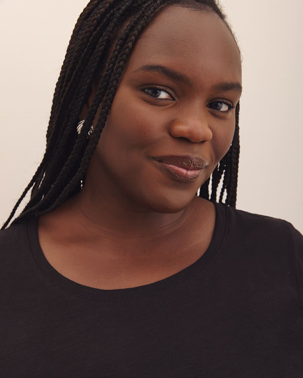 This plus-size tee features a curvy fit and a nice crewneck, which makes it the perfect choice for your casual weekend wear. Comfortable, soft on the skin and trendy, it's a definite wardrobe essential. Features - Stretch knit finish - Solid colour - Crewneck - Short sleeves - Curvy fit - Length: 29.75 in