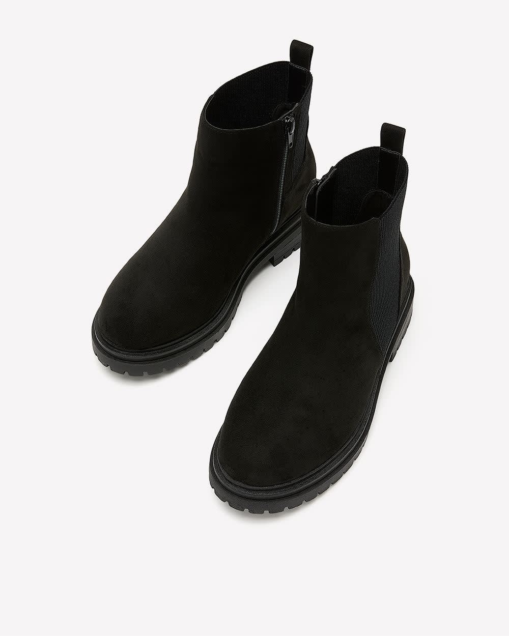 Slip into effortless style with this extra wide chunky Chelsea bootie. Featuring stretchy side gore, a side zipper, and a cushioned insole, it combines timeless design with all-day comfort in an extra wide width fit. Features - Faux suede finish - Side quarter gore panel - Full side zipper - Back pull tab - Padded sock - Chelsea design - Low heel - Extra wide width