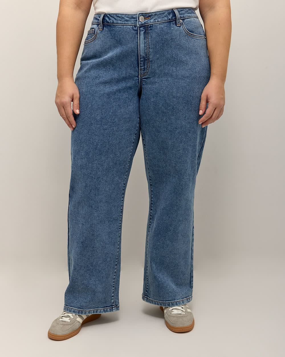 Time travelling is easy with these beautiful plus-size 90s mid-rise and straight leg jeans in a beautiful dark medium wash. Thanks to the regular fit and 5-pocket design, they provide all you need to elevate your everyday style.