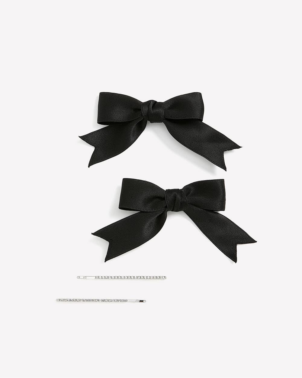 Elevate your hair styles with these two pairs of barrettes! Combining a pair of elegant rhinestones barrettes and a pair of playful black bow barrettes, this set of hair accessories is perfect for any occasion.