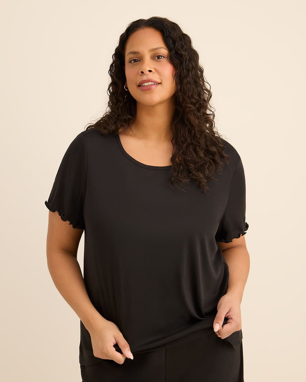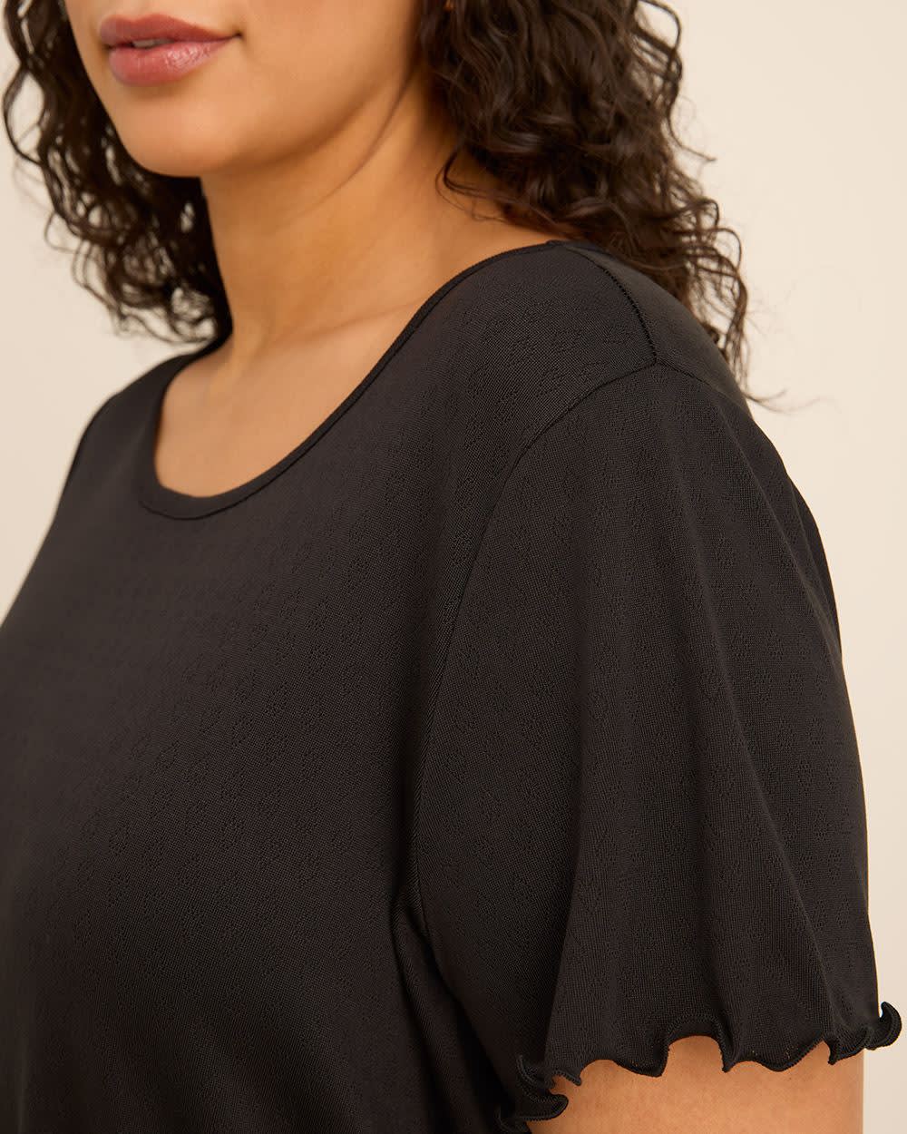 Crafted in a lightweight heart pointelle finish, this crewneck pyjama top adorned with a feminine lettuce edges on the short sleeves ensure ultimate comfort and style.