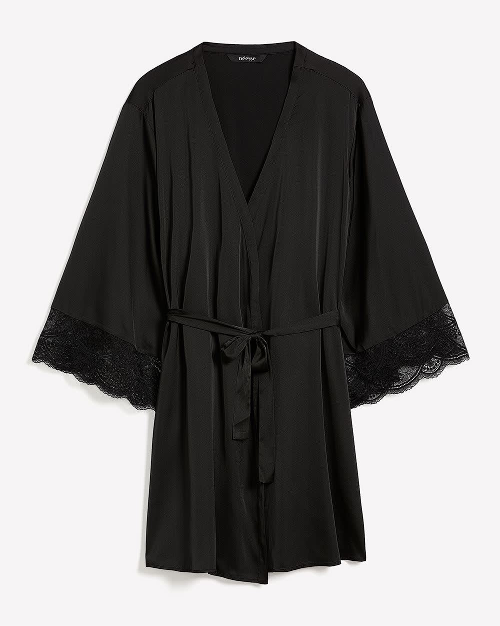 Black Sexy Satin Kimono Robe with Lace Cuffs - Déesse Collection