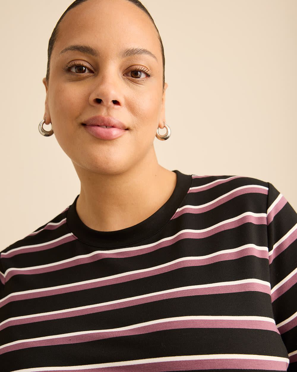 ONLINE EXCLUSIVE. Simple yet sophisticated, this plus-size knit dress is fashioned in a figure-flattering straight fit, with a classic crewneck and trendy tricolore stripes. And its removable belt makes it a versatile choice for any event.
