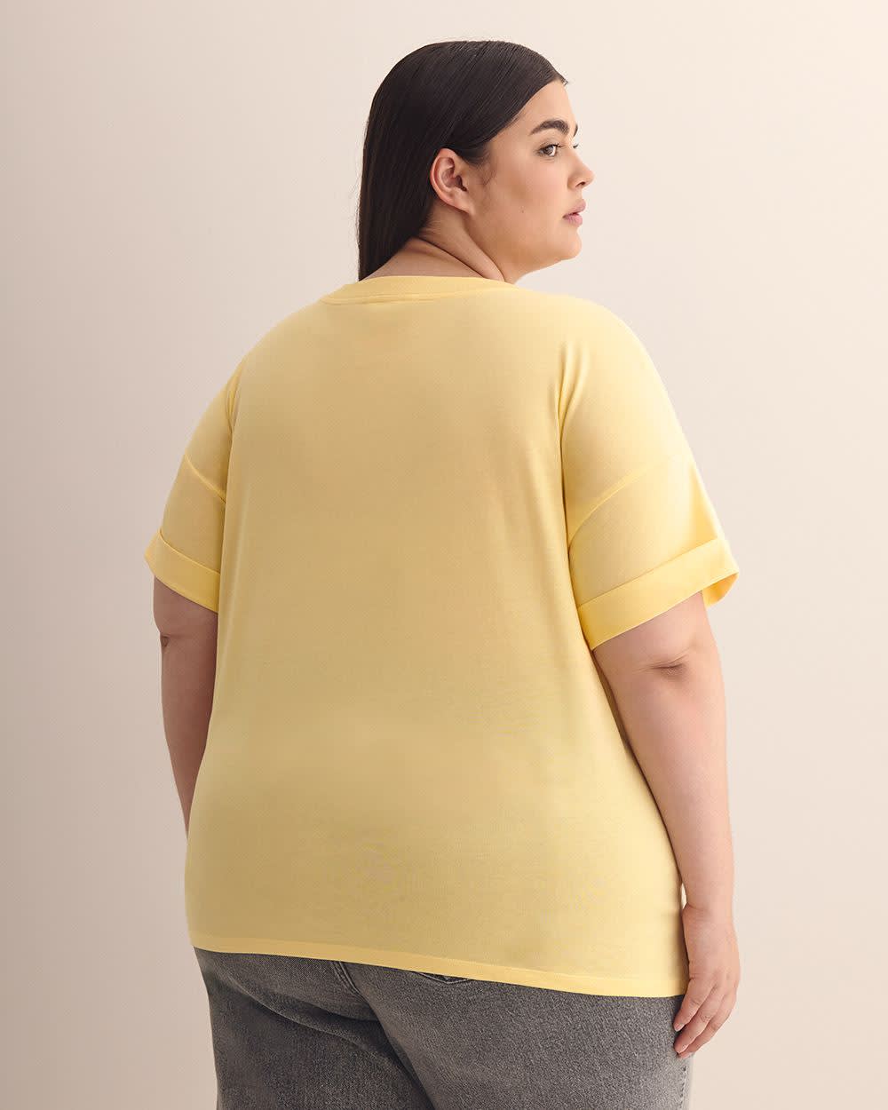 Classic, trendy and comfortable. This classic plus-size crewneck short-sleeve t-shirt features a trendy boxy fit, making it year-round staple top. Perfect with leggings or sweatpants, it can also look great with your high-waisted jeans.