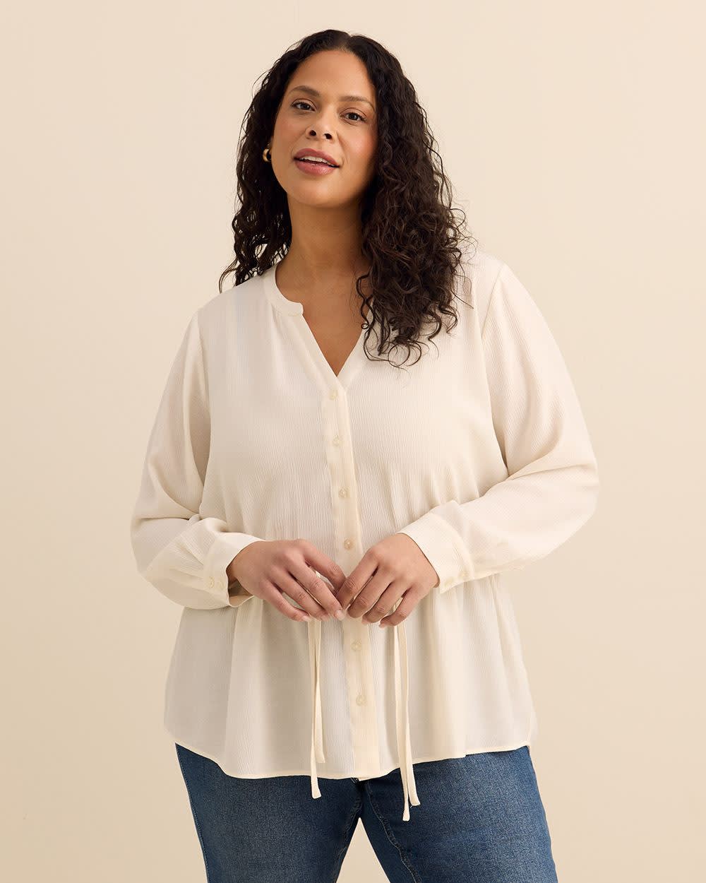 Crisp, chic, and effortlessly feminine. This plus-size buttoned-down shirt defines your waist with a flattering bow-tie cinch and flows into a graceful fit-and-flare silhouette-perfect for polished days or elevated everyday style.