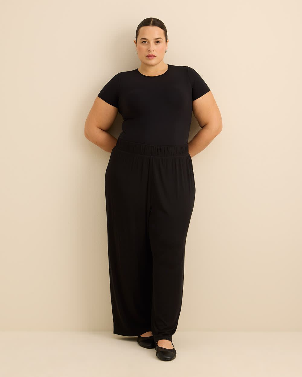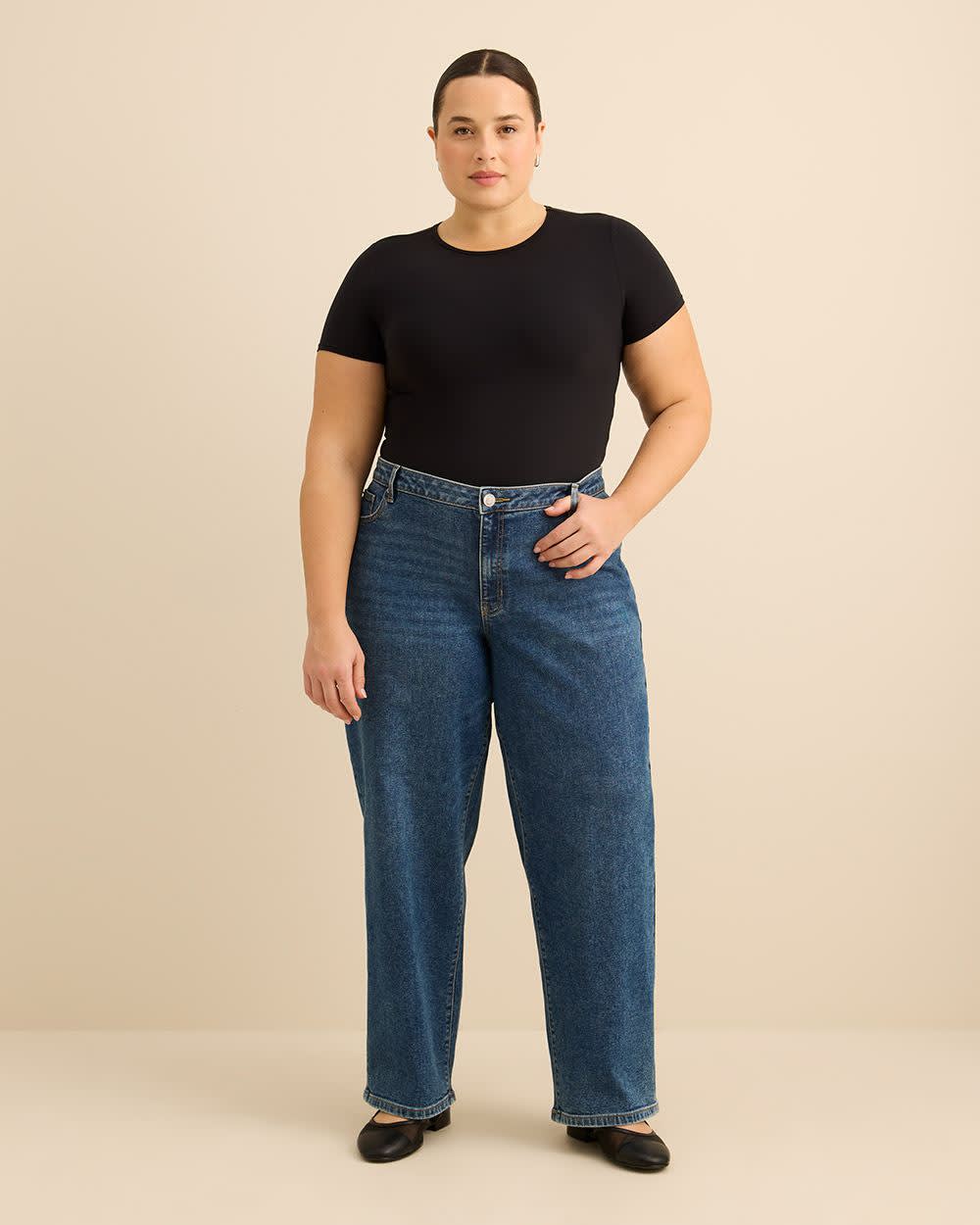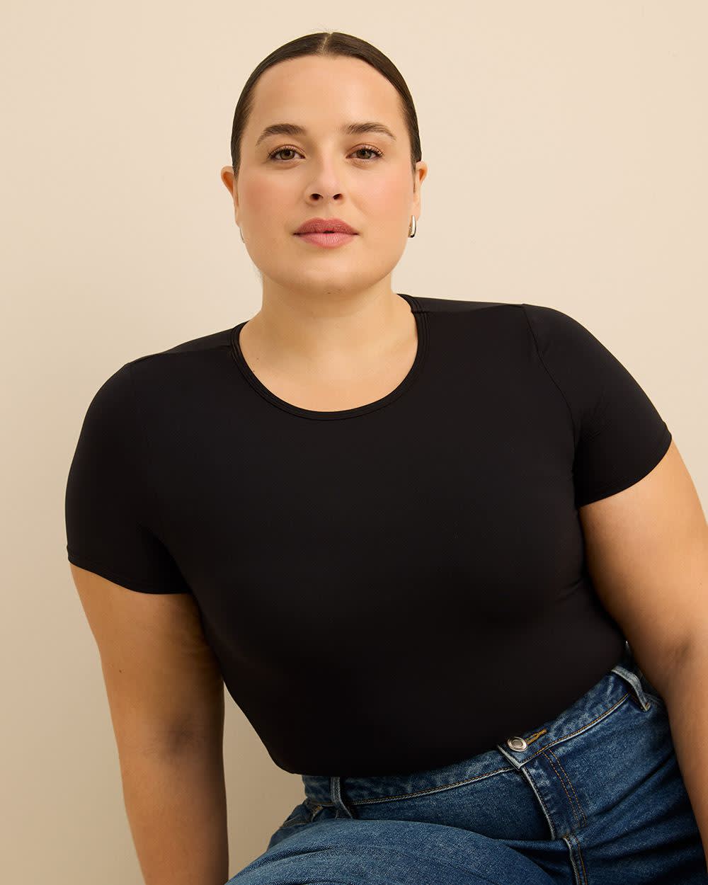 ONLINE EXCLUSIVE. Smooth, stretchy, and just a little cheeky. This plus-size knit bodysuit hugs your curves with a sleek bodycon fit and soft, breathable fabric. Perfect for a confident, effortless look.