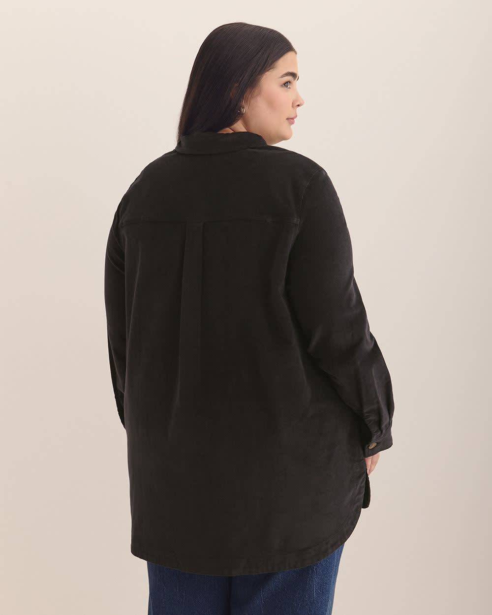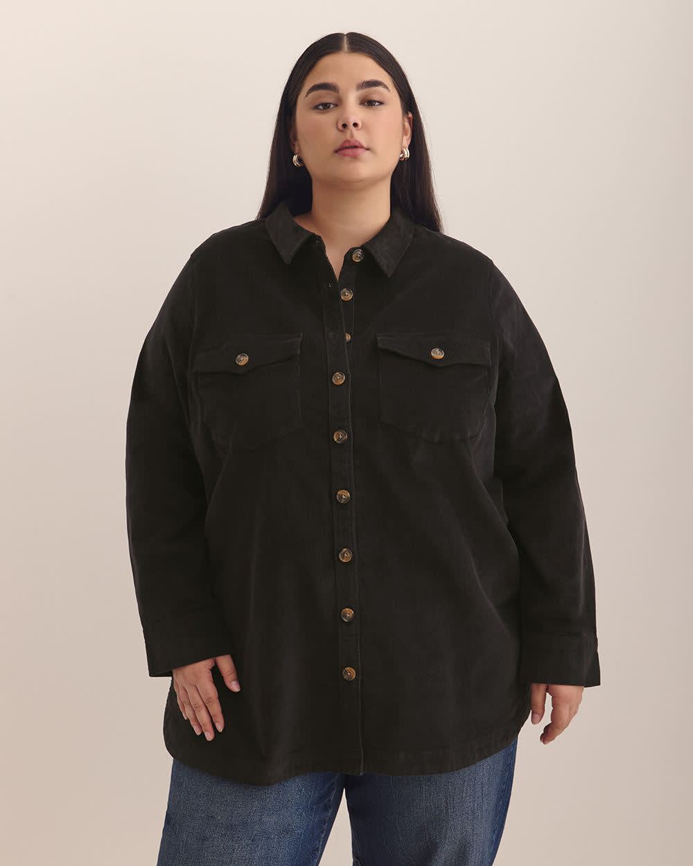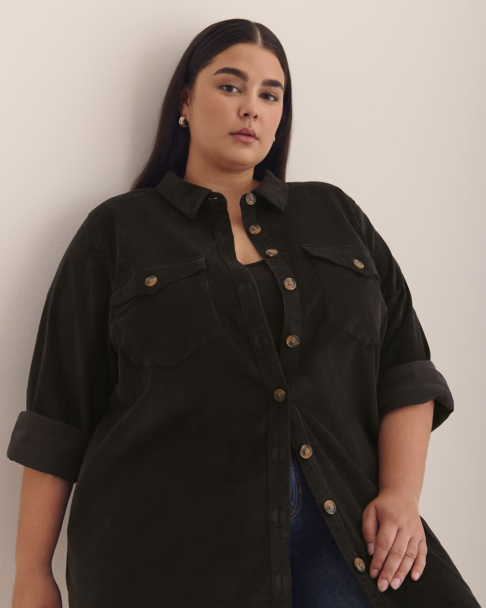 Get ready to level up your style with this stunning plus-size corduroy shirt. Crafted to revolutionize your fashion journey, this buttoned-down shirt not only embraces the latest trends but also adds a touch of casual chic to your look, whether paired to your go-to denim and an elegant top or to a sophisticated pencil skirt.