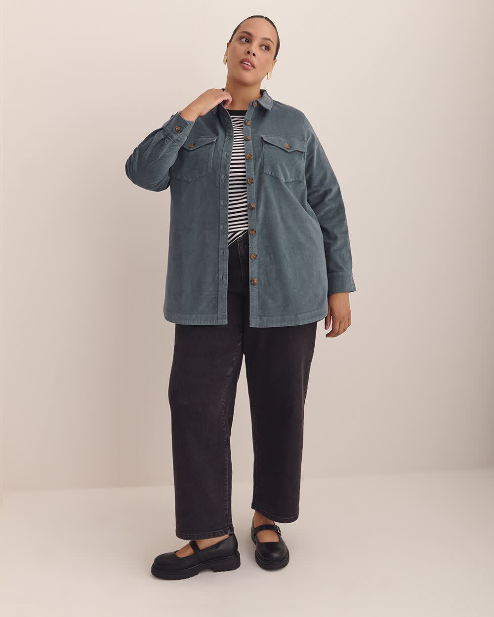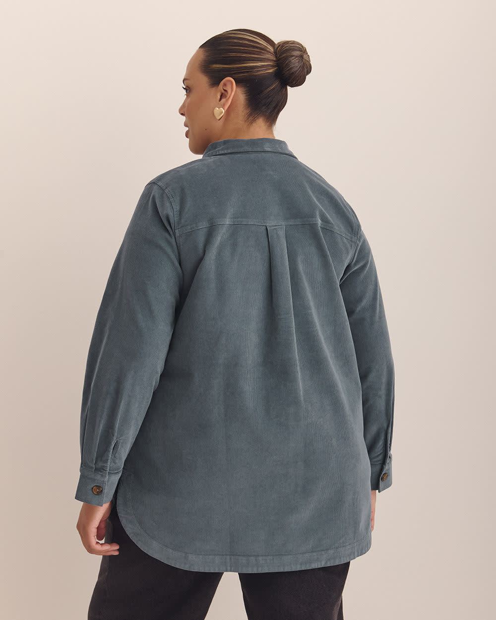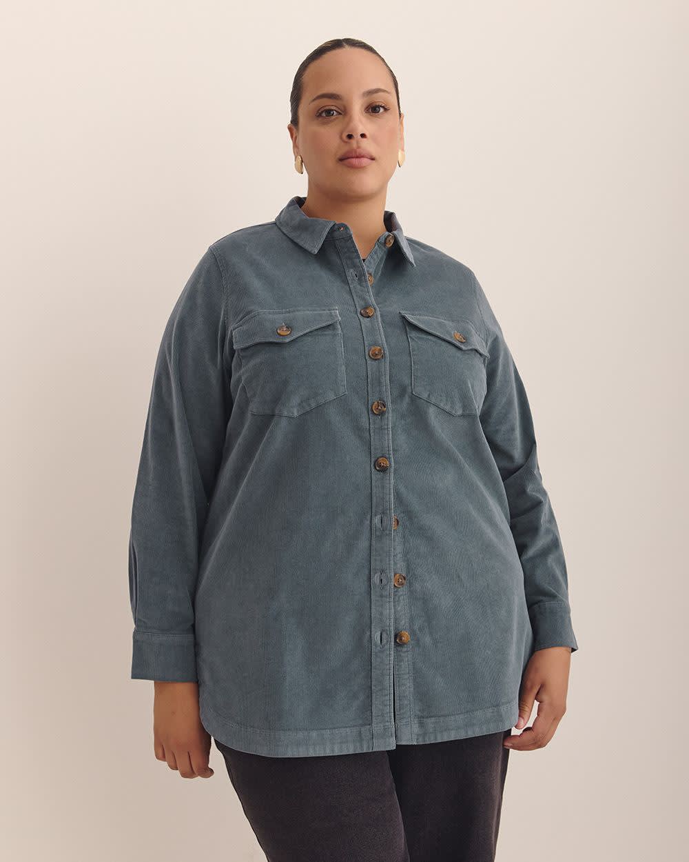 Get ready to level up your style with this stunning plus-size corduroy shirt. Crafted to revolutionize your fashion journey, this buttoned-down shirt not only embraces the latest trends but also adds a touch of casual chic to your look, whether paired to your go-to denim and an elegant top or to a sophisticated pencil skirt.