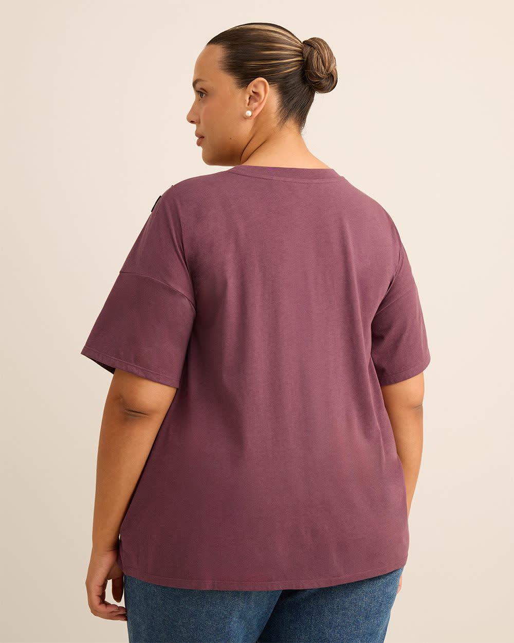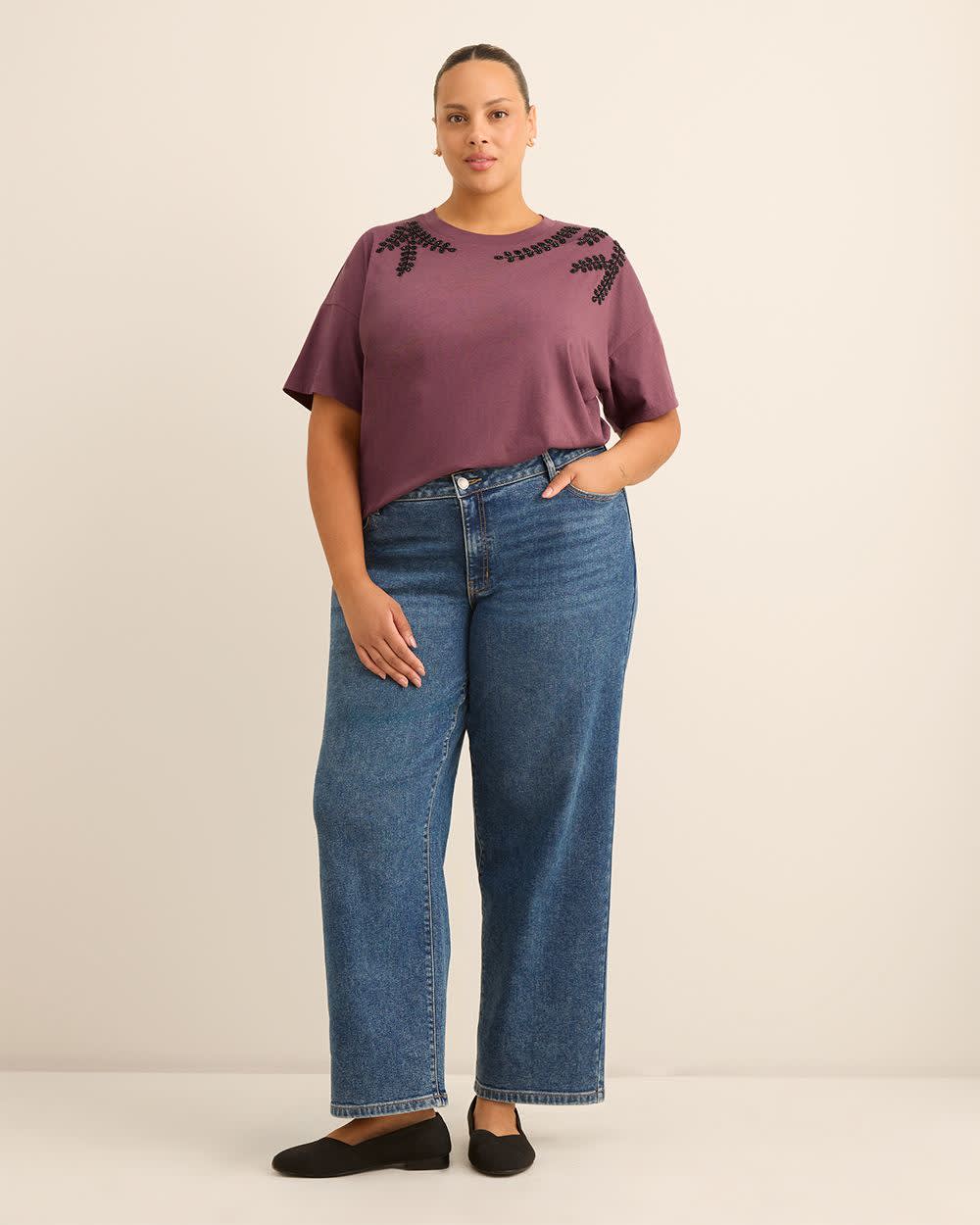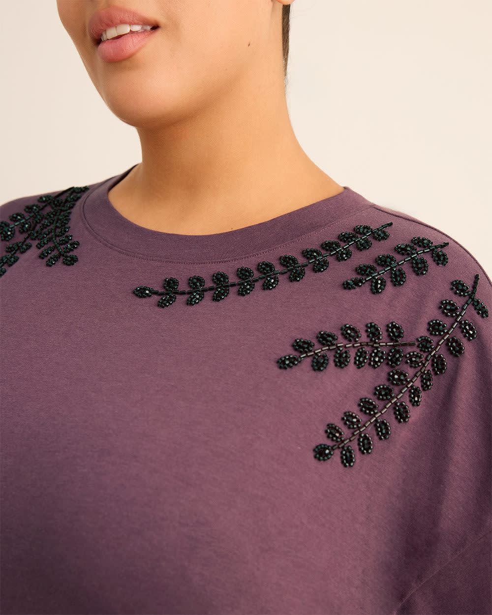 Shine with subtle elegance in this plus-size short-sleeve crewneck tee featuring a rhinestone leaf design. Soft cotton comfort meets a touch of sparkle for effortless everyday style.