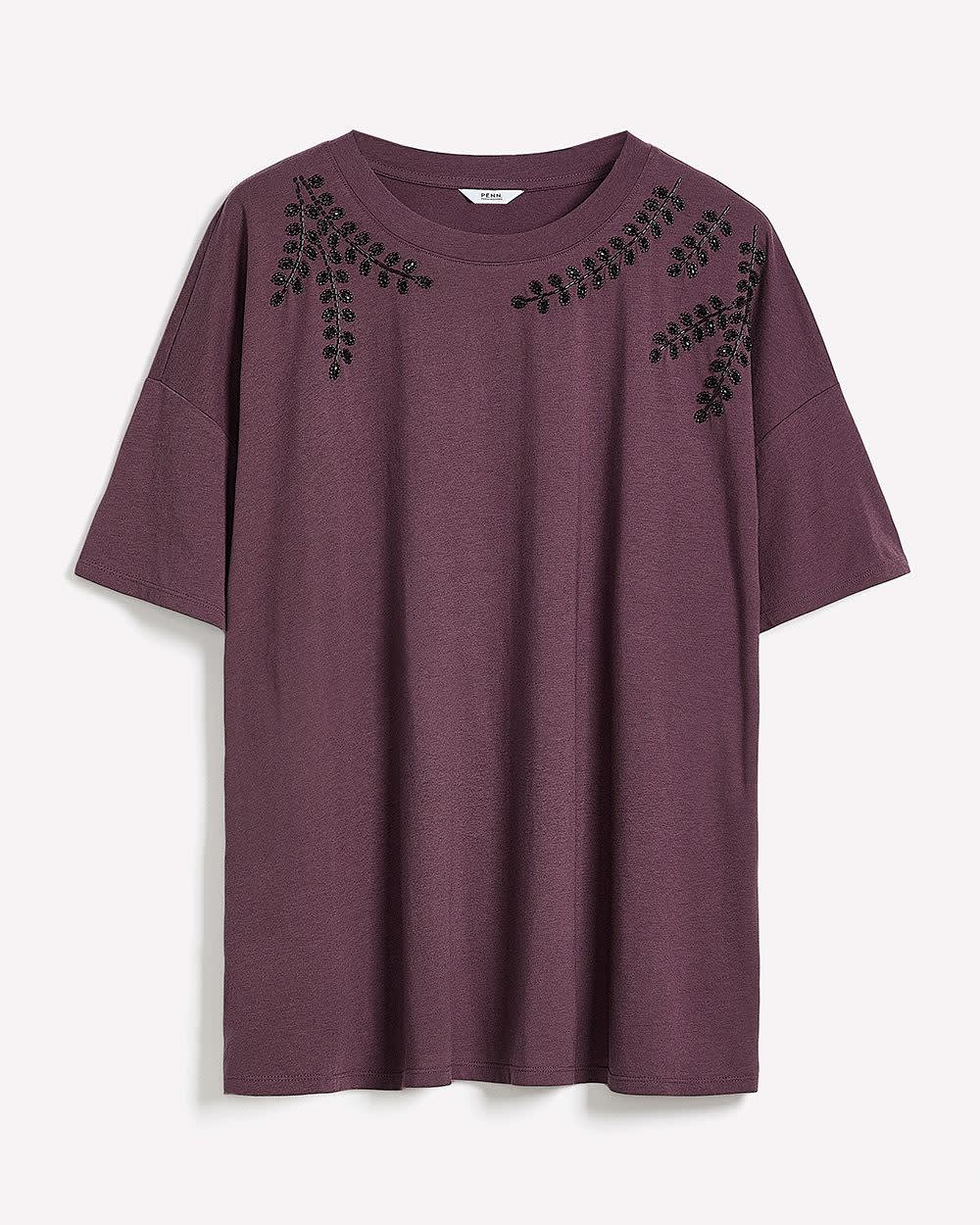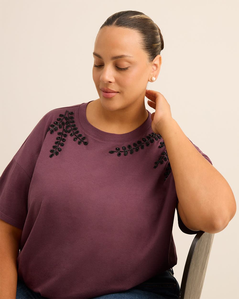 Shine with subtle elegance in this plus-size short-sleeve crewneck tee featuring a rhinestone leaf design. Soft cotton comfort meets a touch of sparkle for effortless everyday style.