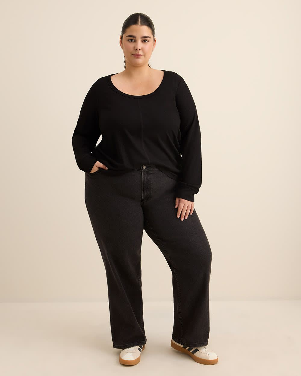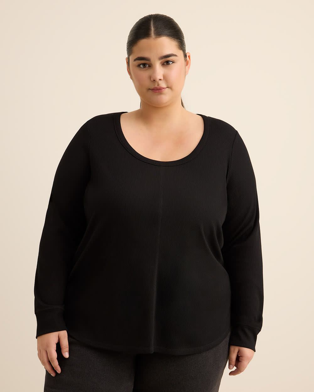 Keep it cozy and confident with this plus-size curvy-fit waffle knit top. Featuring a scoop neckline and subtle coverstitch details, it flatters your shape while offering all-day comfort.