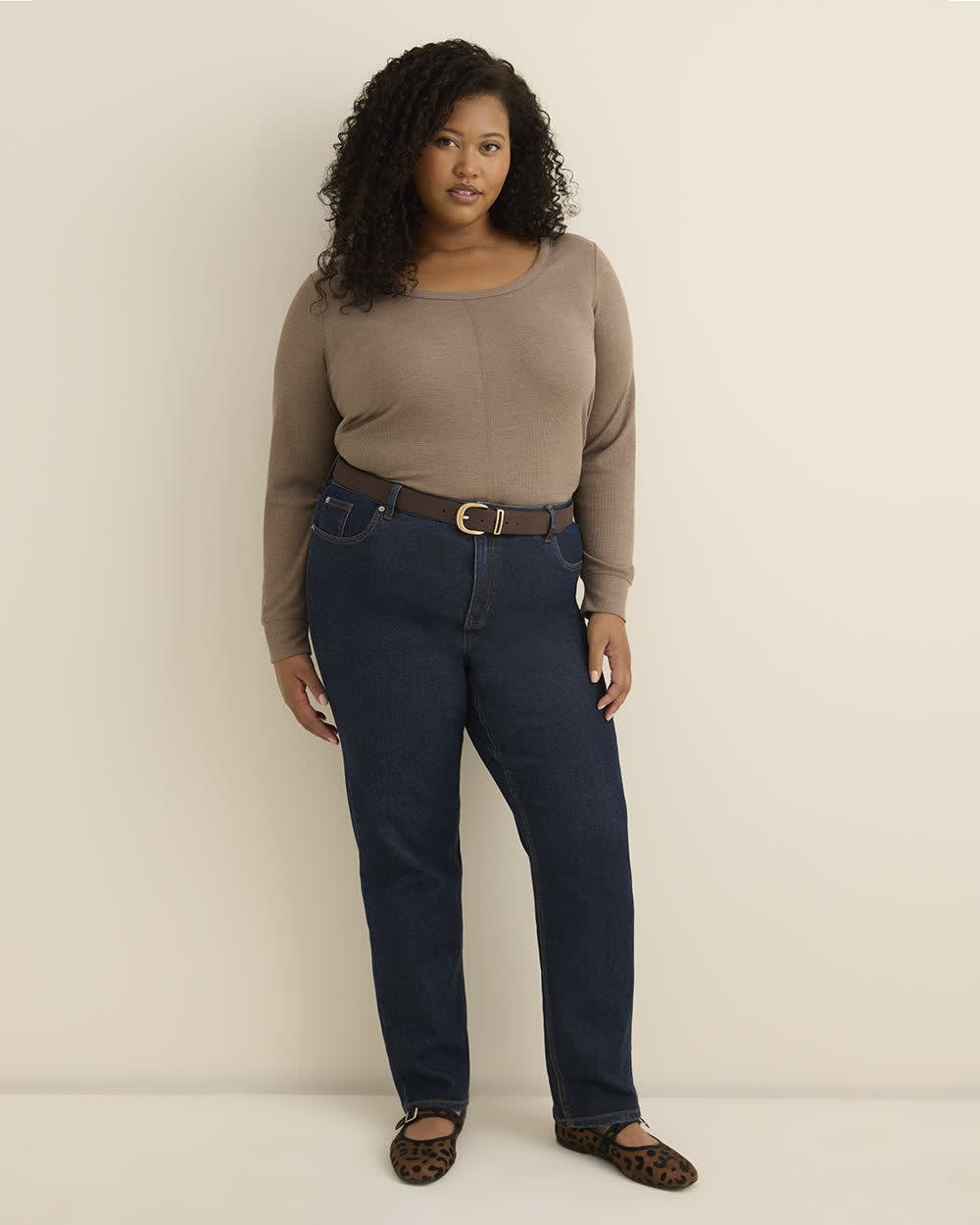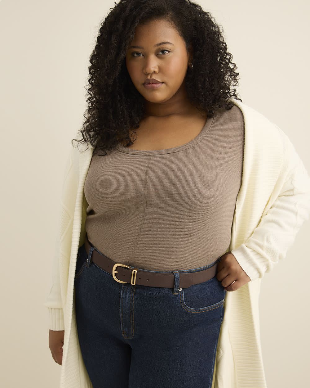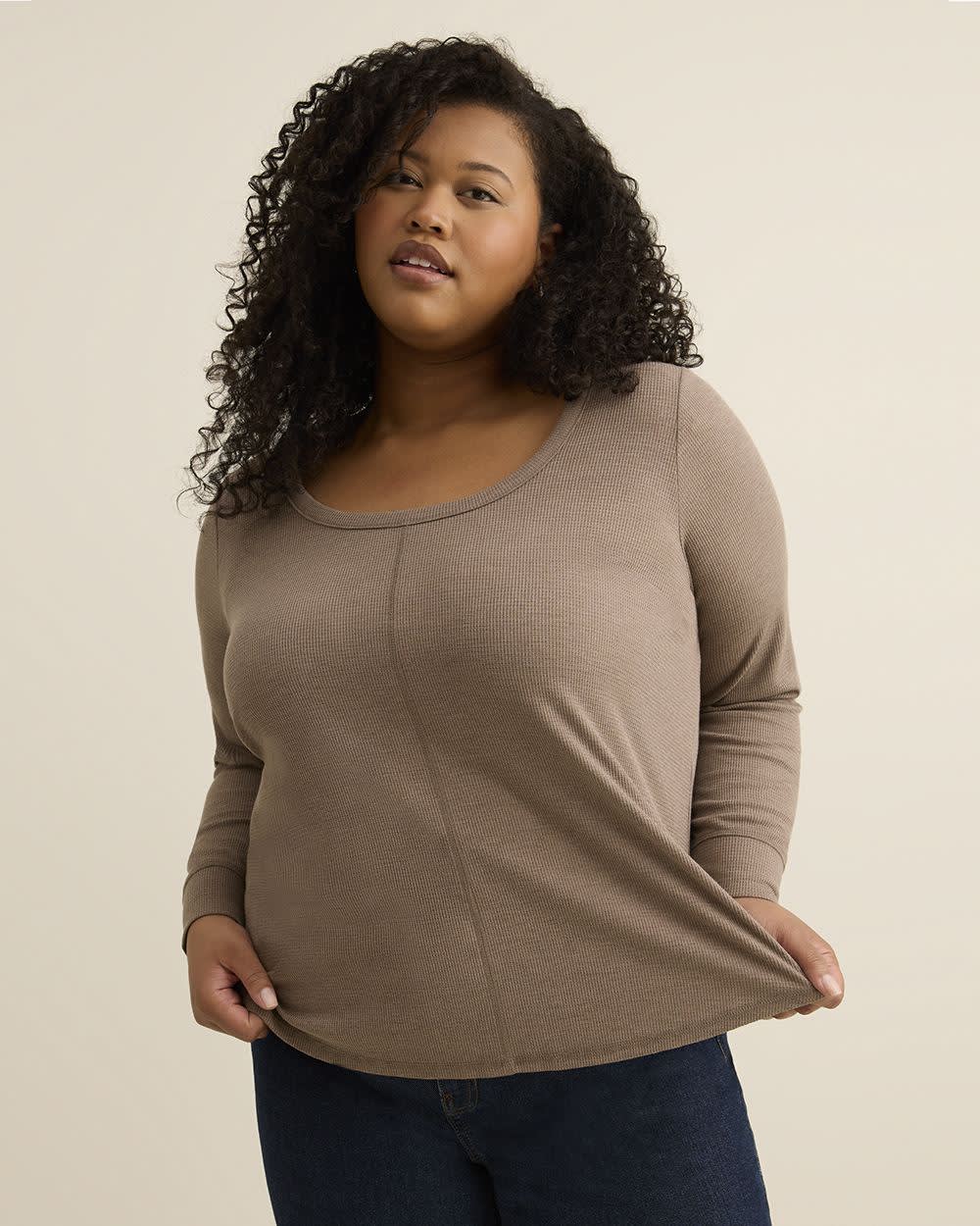 Keep it cozy and confident with this plus-size curvy-fit waffle knit top. Featuring a scoop neckline and subtle coverstitch details, it flatters your shape while offering all-day comfort.