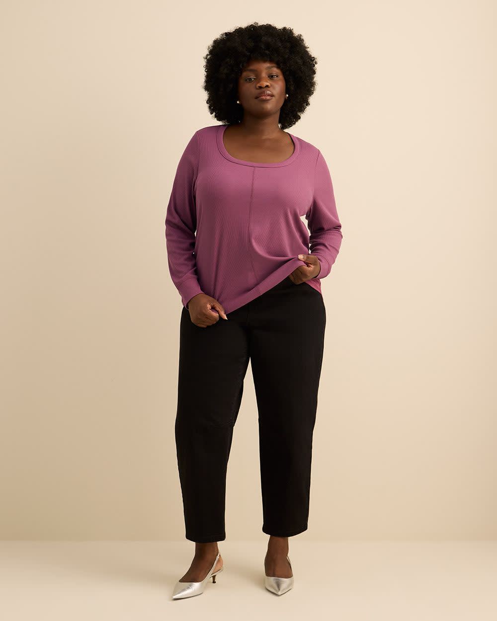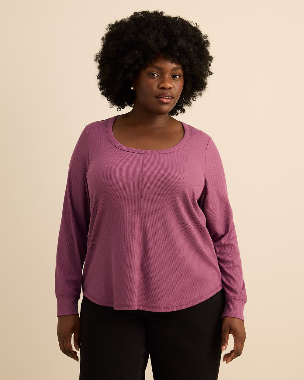 Keep it cozy and confident with this plus-size curvy-fit waffle knit top. Featuring a scoop neckline and subtle coverstitch details, it flatters your shape while offering all-day comfort.