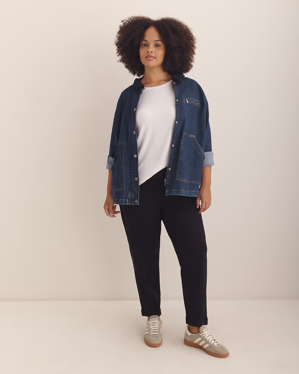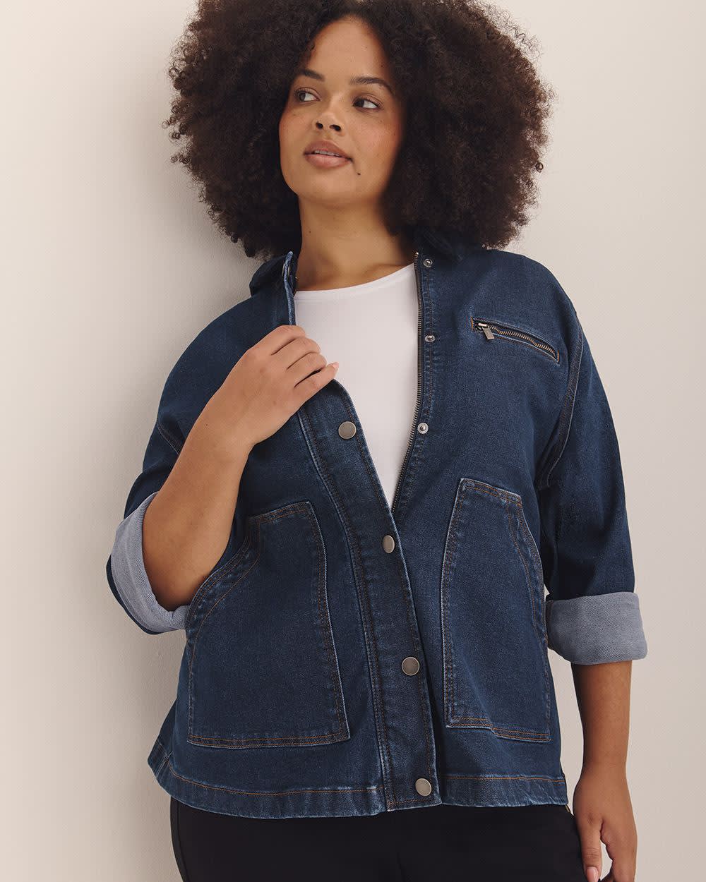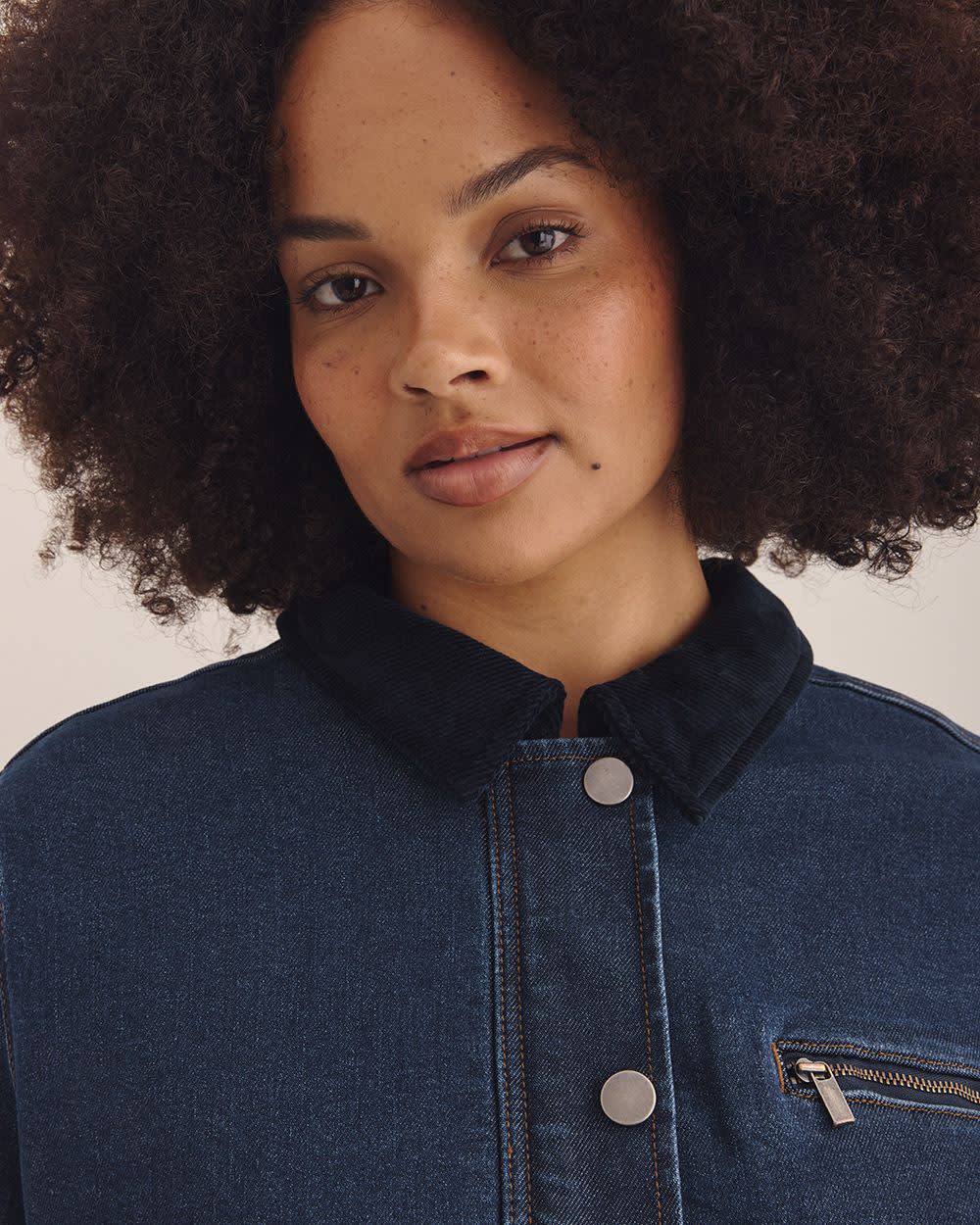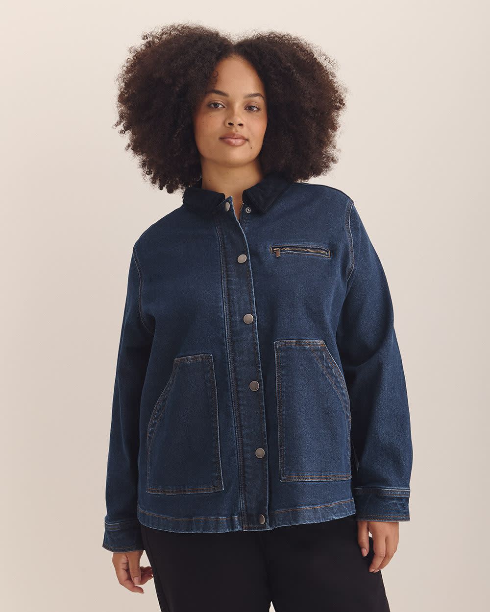A rugged essential with timeless workwear style. This plus-size dark wash denim barn jacket features a corduroy collar, and practical pockets-ideal for layering through changing seasons.