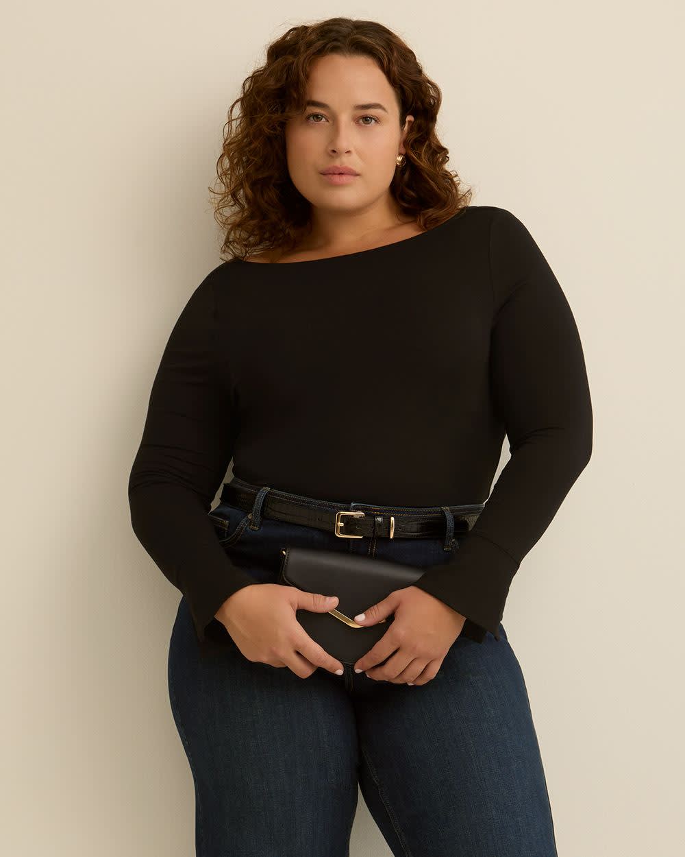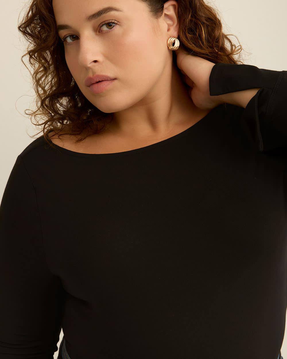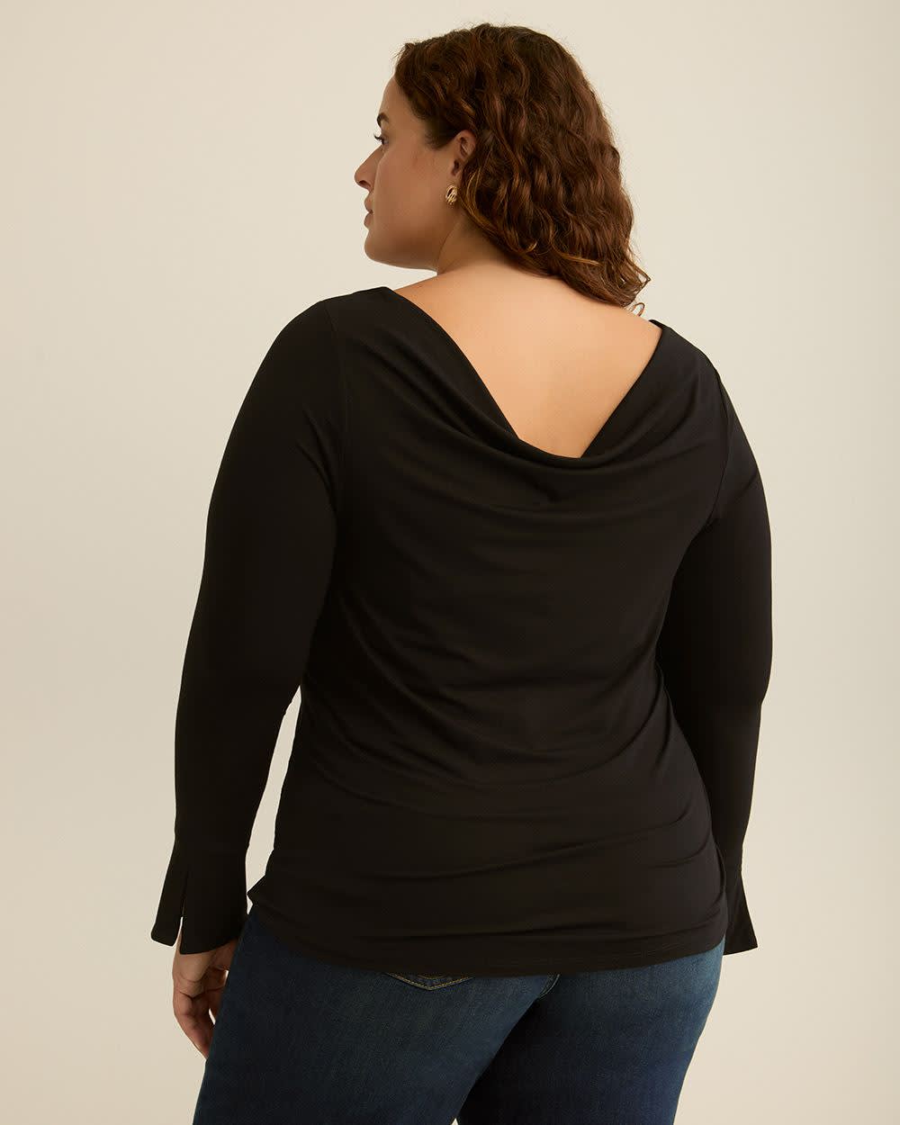 Classic made stylish! This plus-size long-sleeve top is fashioned with a draped boat neckline and slit cuffs that brings a touch of elegance to this everyday knit top.