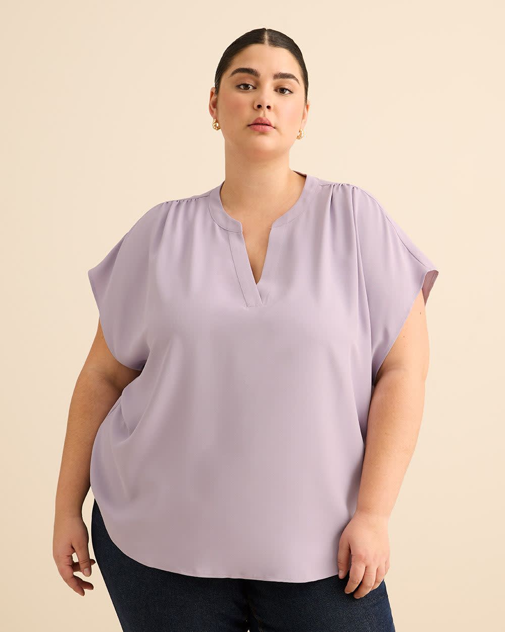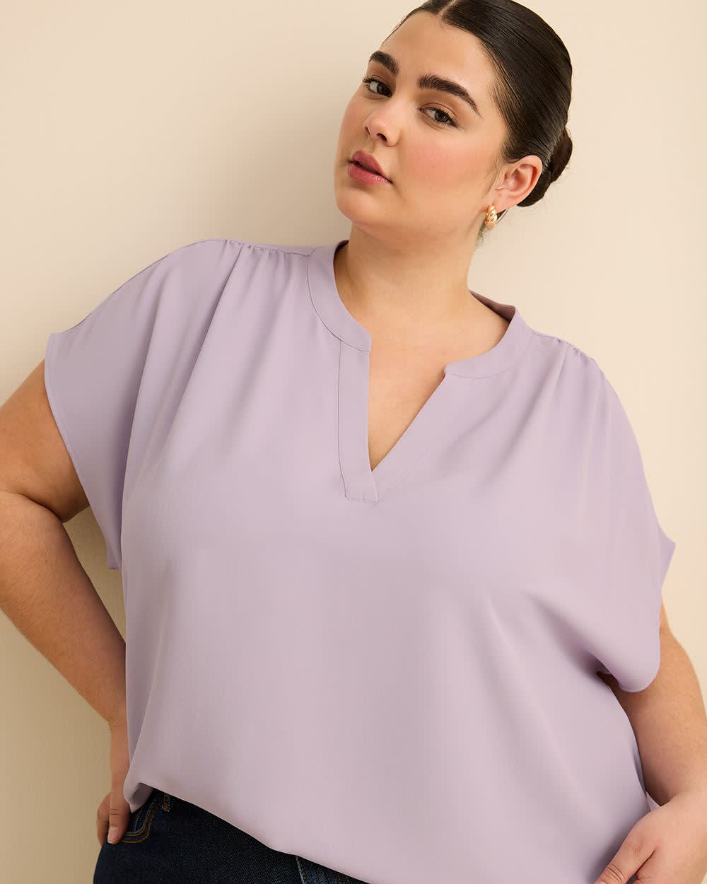 This plus-size blouse featuring a stylish split neckline will keep you looking stylish wherever you go. Designed with extended sleeves and a shirttail hem, this straight-fit shirt will pair well with any bottom in your wardrobe.