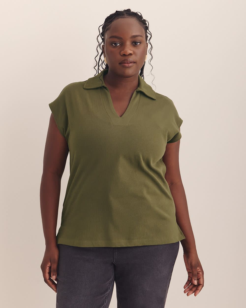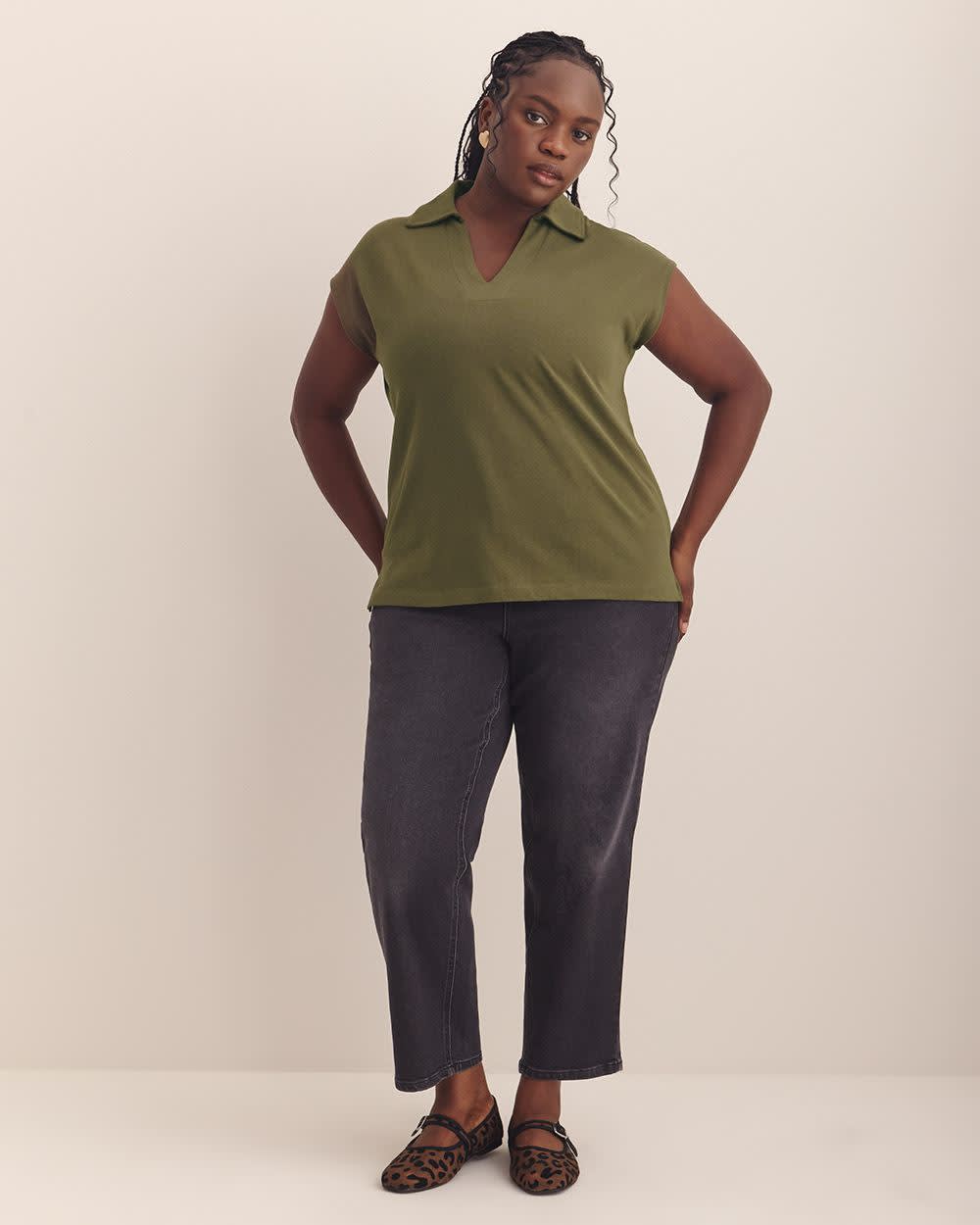 Perfect on its own or peeking out from under a cardigan or a sweater, this plus-size polo is versatility personified. Wear this with trousers or a skirt and a pair of mid-heel shoes for a great office look.