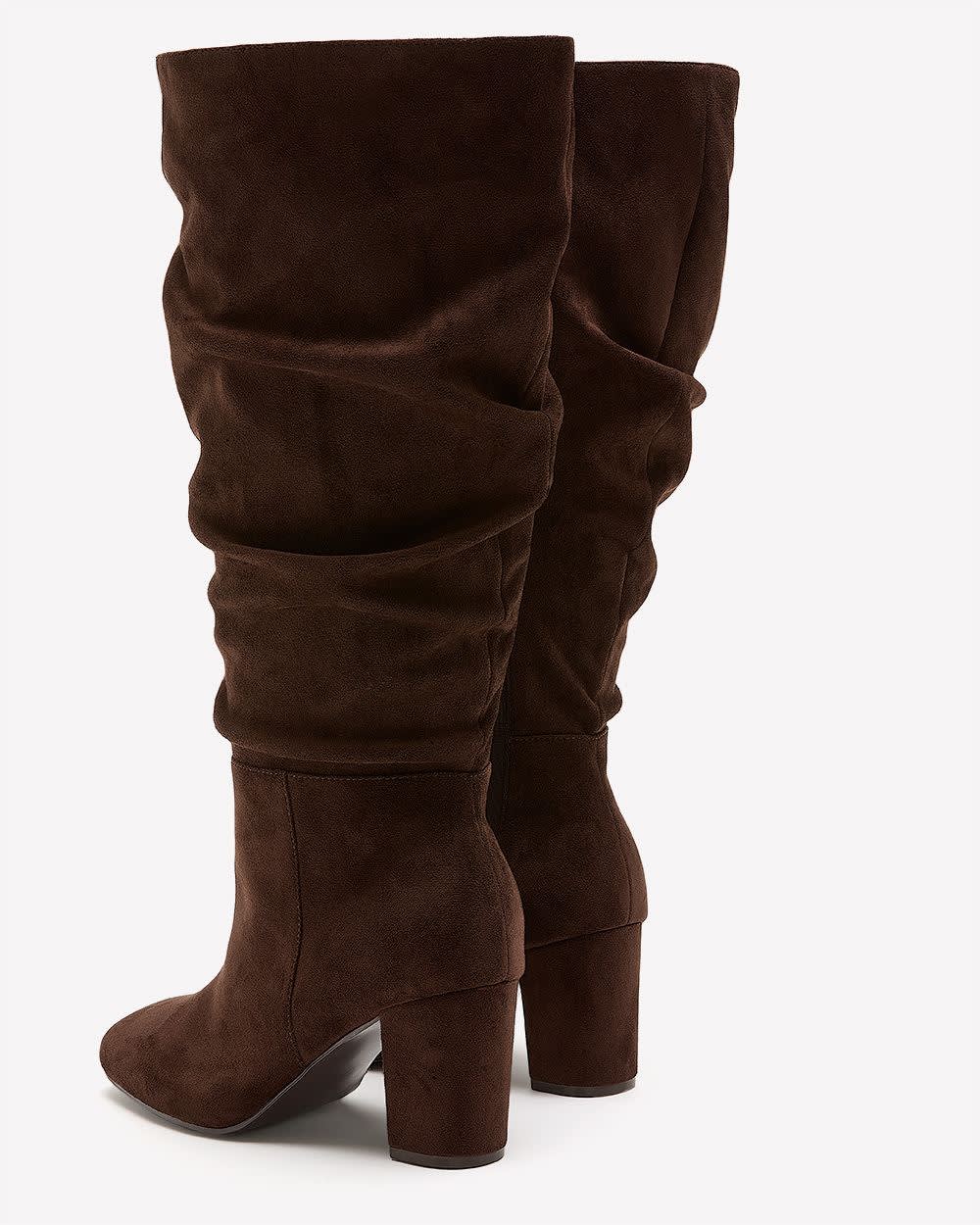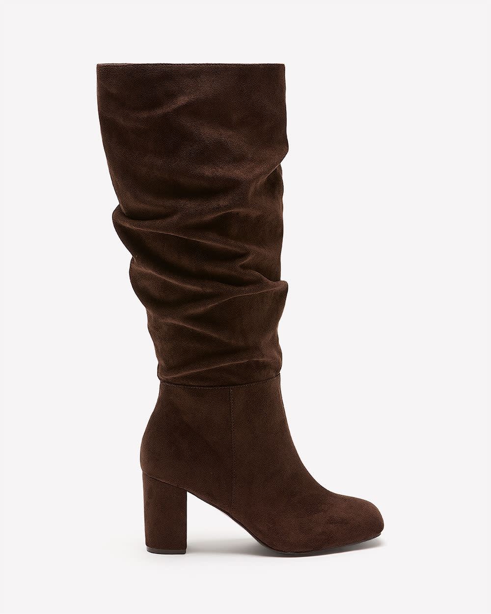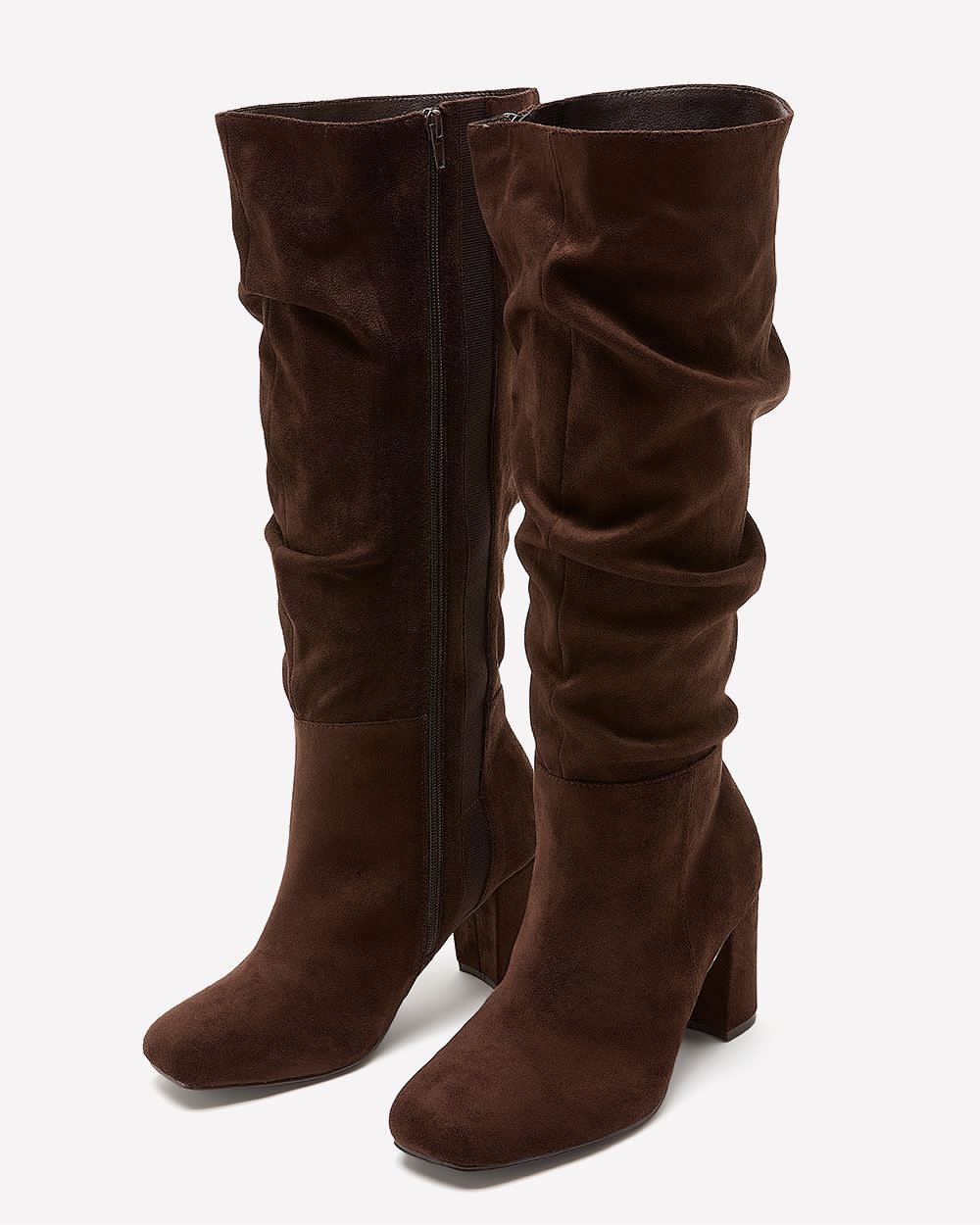 Elevate your style with these tall brown microsuede boots. A pleated shaft and square toe give them standout flair, while the extra-wide fit and block heel keep you walking tall in comfort.