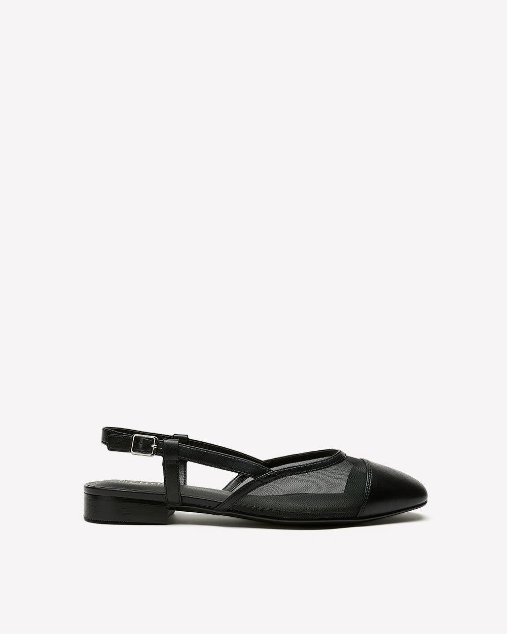 Stylish, comfortable and versatile, these low-block ballet shoes have it all. Made of a blend of faux leather and mesh for a polished look, these wide black slingback shoes are easy to style to create any desired look.