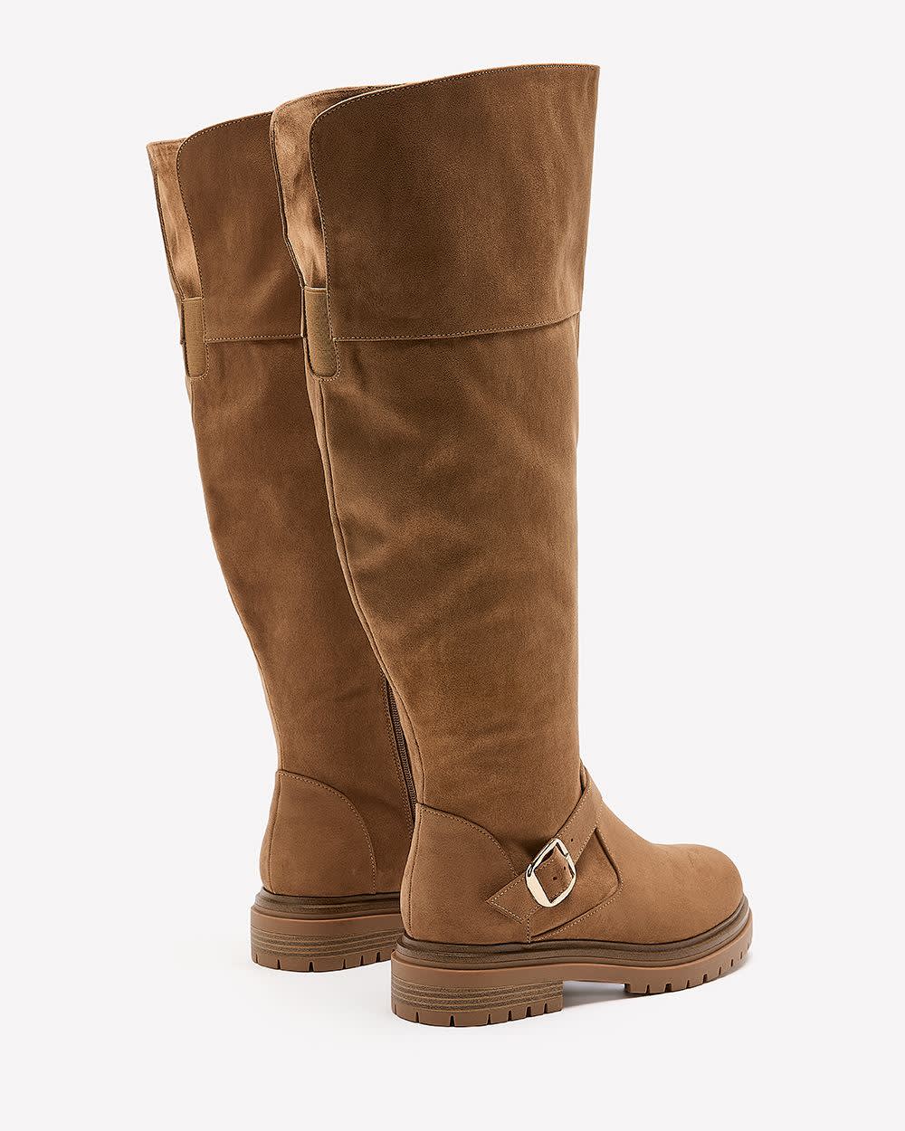 Go bold in these over-the-knee microsuede boots with fold-over collar and buckle straps. The extra-wide fit and low heel keep them as comfortable as they are striking.