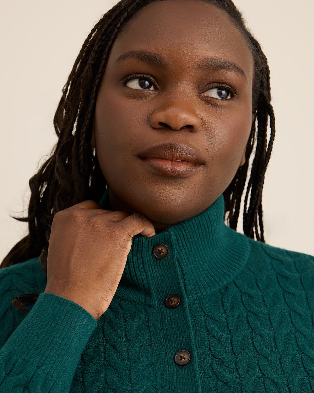 Stylish, cozy and super versatile. Fashioned in a cable-stitch knit fabric, this plus-size half-placket sweater is perfect to keep you warm and on trend on any occasion.