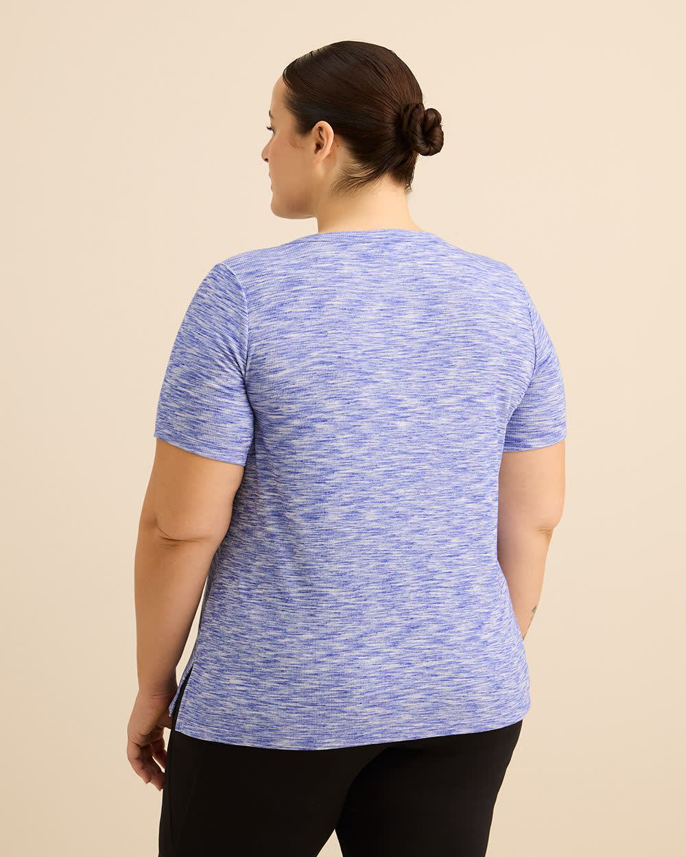 Designed in a textured rib knit, this plus-size short-sleeve tee is an everyday essential, especially with its heather finish, side slits, and moisture-wicking properties. Perfect for any activities.