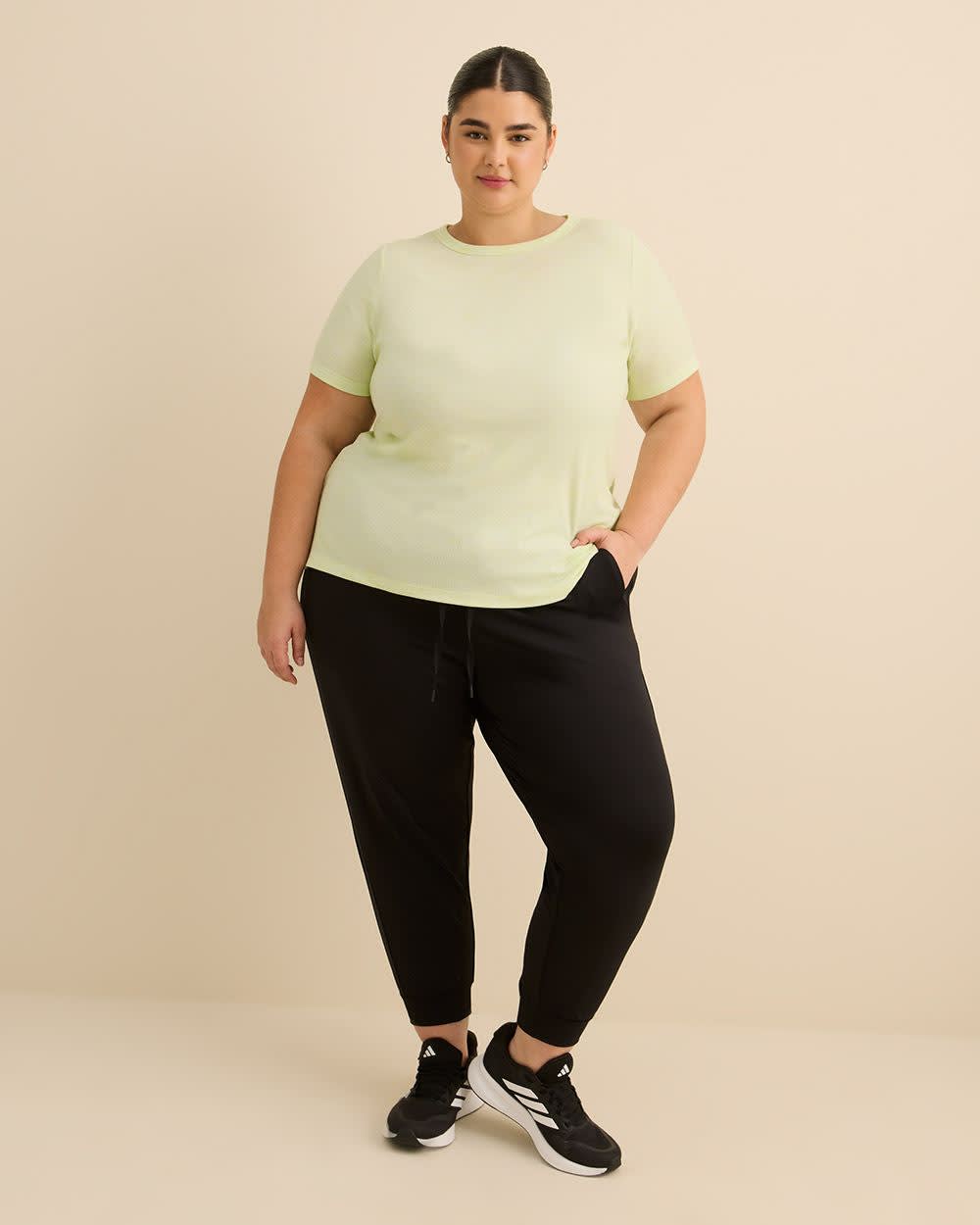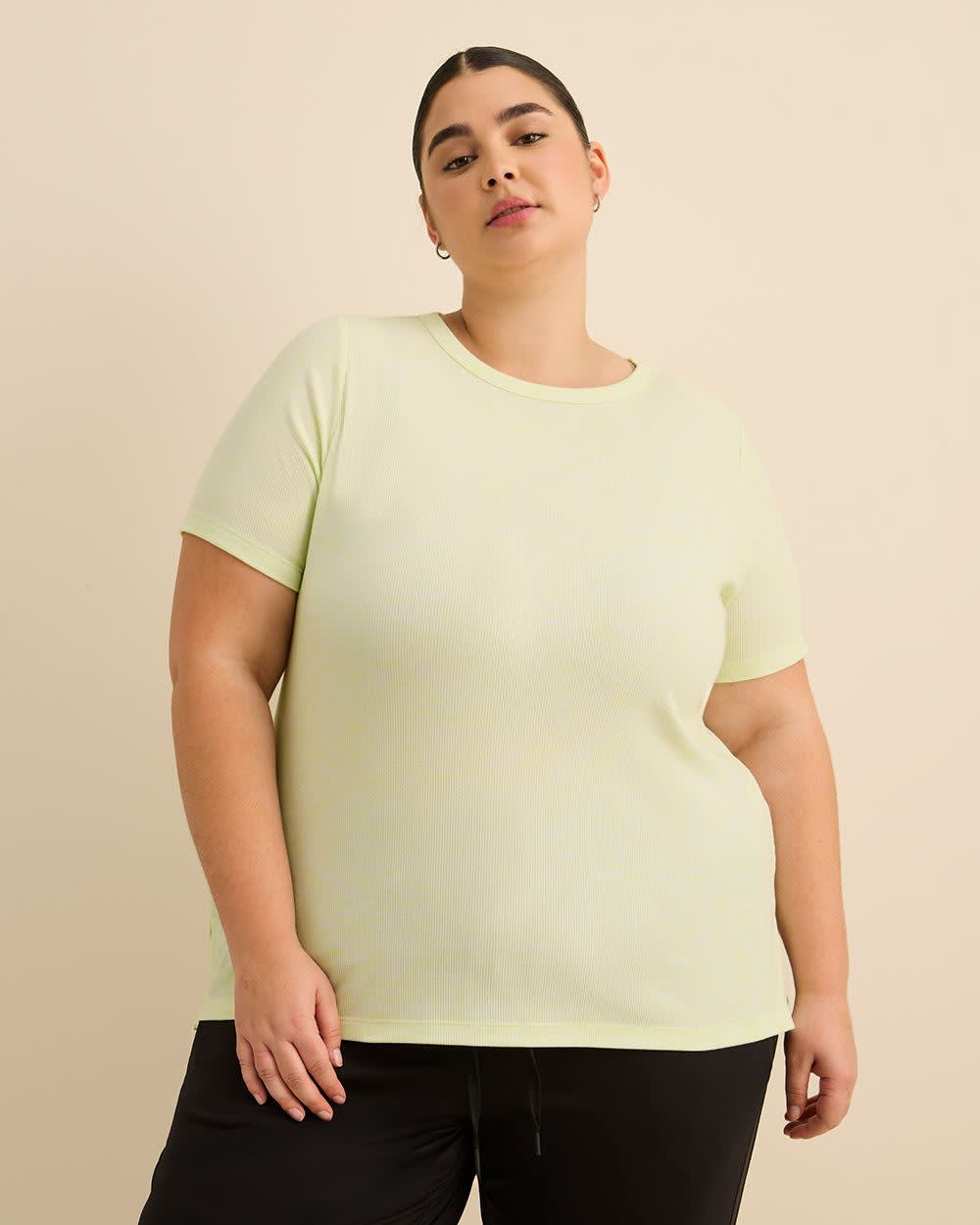 Designed in a textured rib knit, this plus-size short-sleeve tee is an everyday essential, especially with its heather finish, side slits, and moisture-wicking properties. Perfect for any activities.