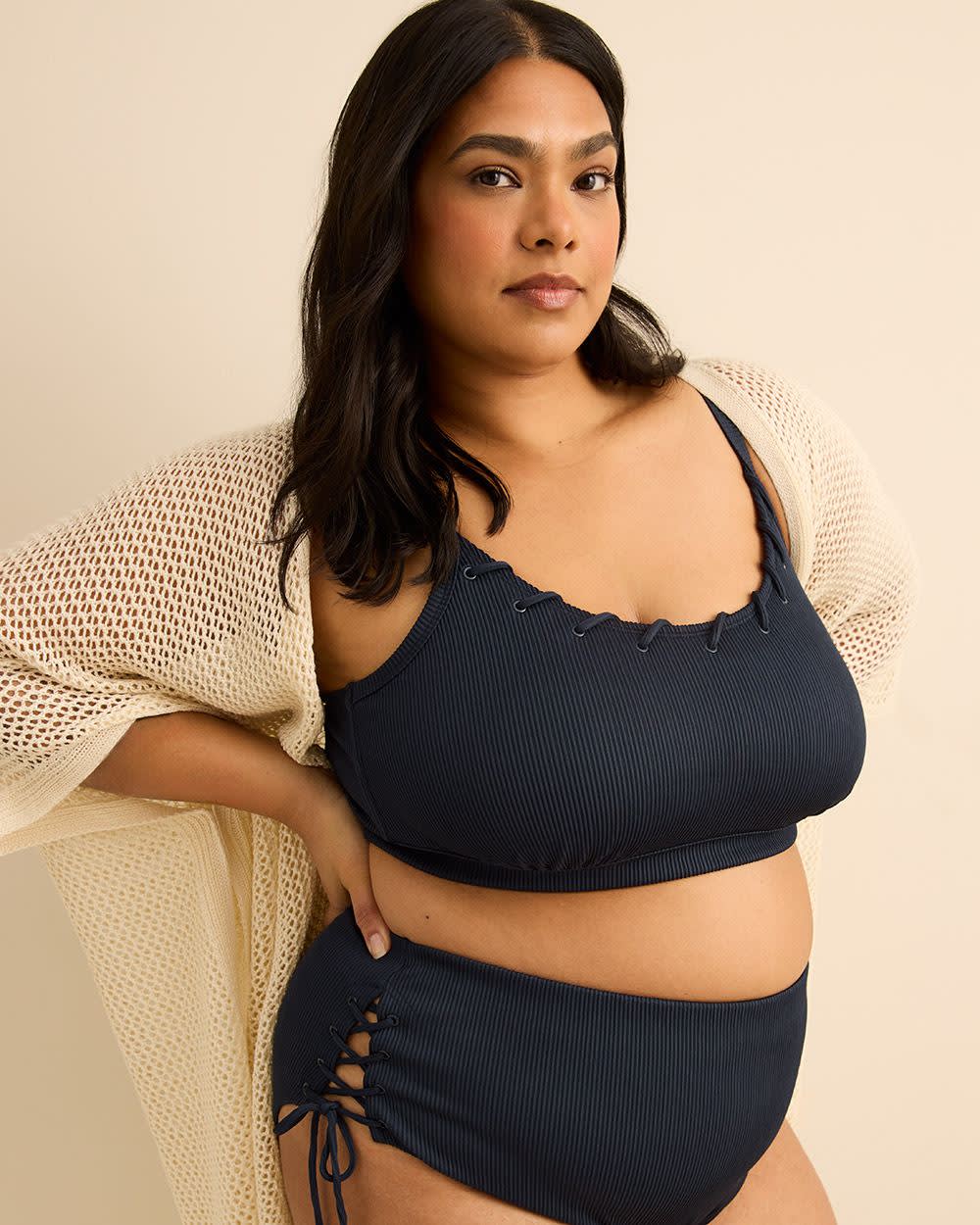Enjoy some good waves in this plus-size high-waisted mesh swim brief with lace-up sides.Designed with tummy control and a leg-lengthening cut, it flatters your shape with bold, confident style.