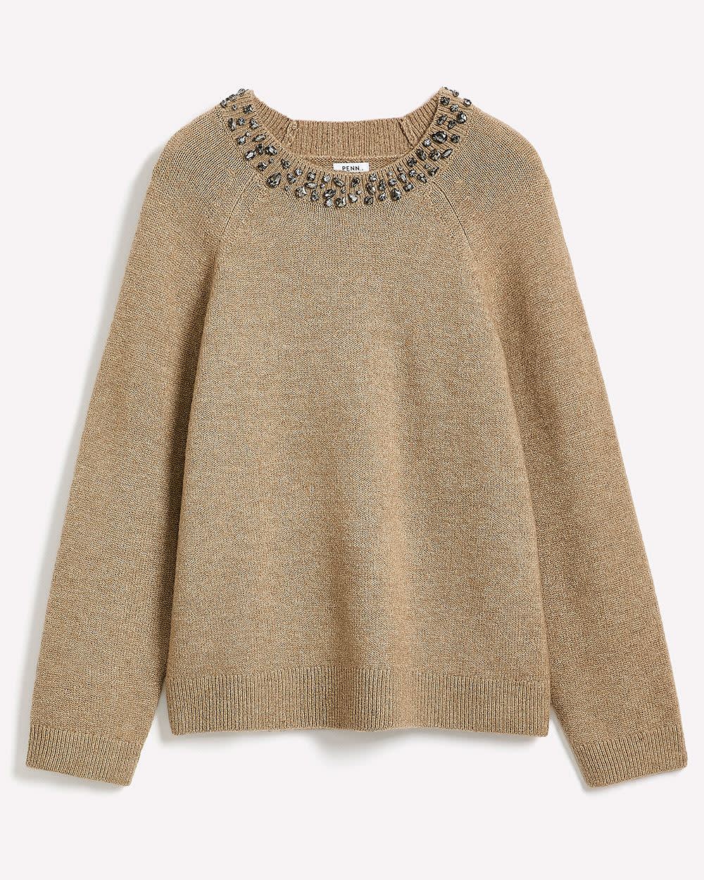 Crafted in a soft blend of wool, this plus-size crewneck sweater has something special: multi-size glimmering stones all along the neckline to give an extra spark to your every bottom, from your casual denim to your formal trousers and skirts.