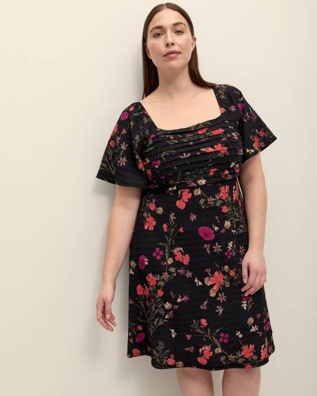 "Easy, breezy, this fluttering plus-size summer dress is made of an elegant textured knit, topped with a modern square neckline and a flattering pleating front panel, and framed by elbow-length fluttered sleeves. This is without a doubt a feminine and easy-to-style option this summer!