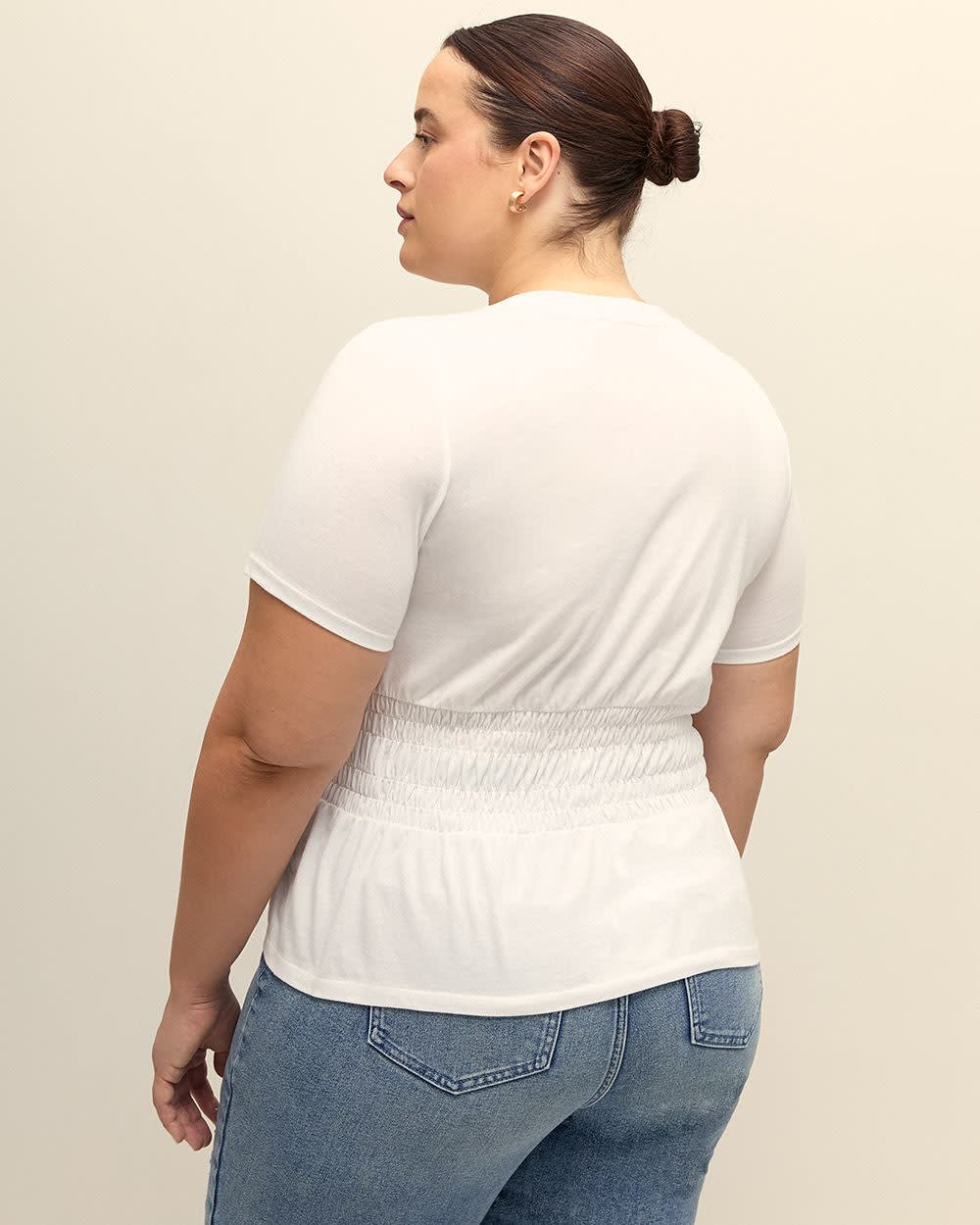 Super feminine, you'll love the fit and flare silhouette of this plus-size fashion knit top. Featuring short sleeves and flattering smocked band that cinches your waist, this piece pairs perfectly with any bottom.