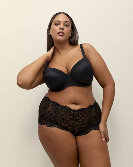 The perfect blend of romantic style and undeniable comfort! This plus-size boyshort brief is made entirely of lace, cut in a way that covers your cheeks for a seamless look.