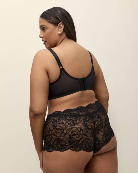 The perfect blend of romantic style and undeniable comfort! This plus-size boyshort brief is made entirely of lace, cut in a way that covers your cheeks for a seamless look.