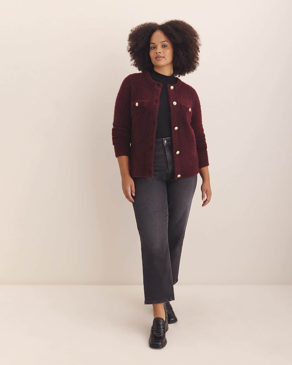 Simple design, refined style, and trendy fit. This plus-size lady-like sweater cardigan is made of a wool blend for comfort, with a boxy fit and buttoned down front for style. Perfect from casual wear to elegant ensembles.