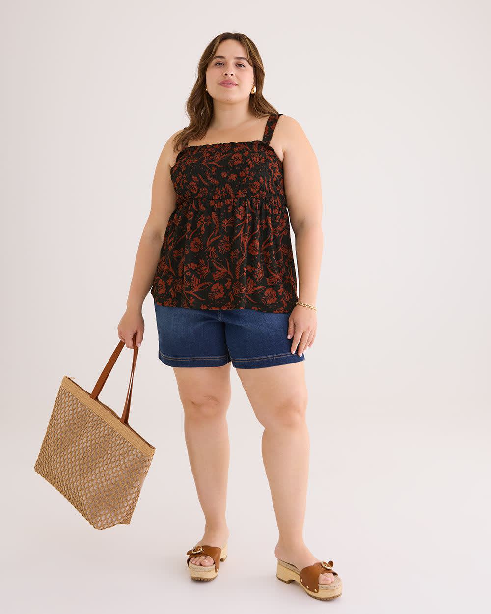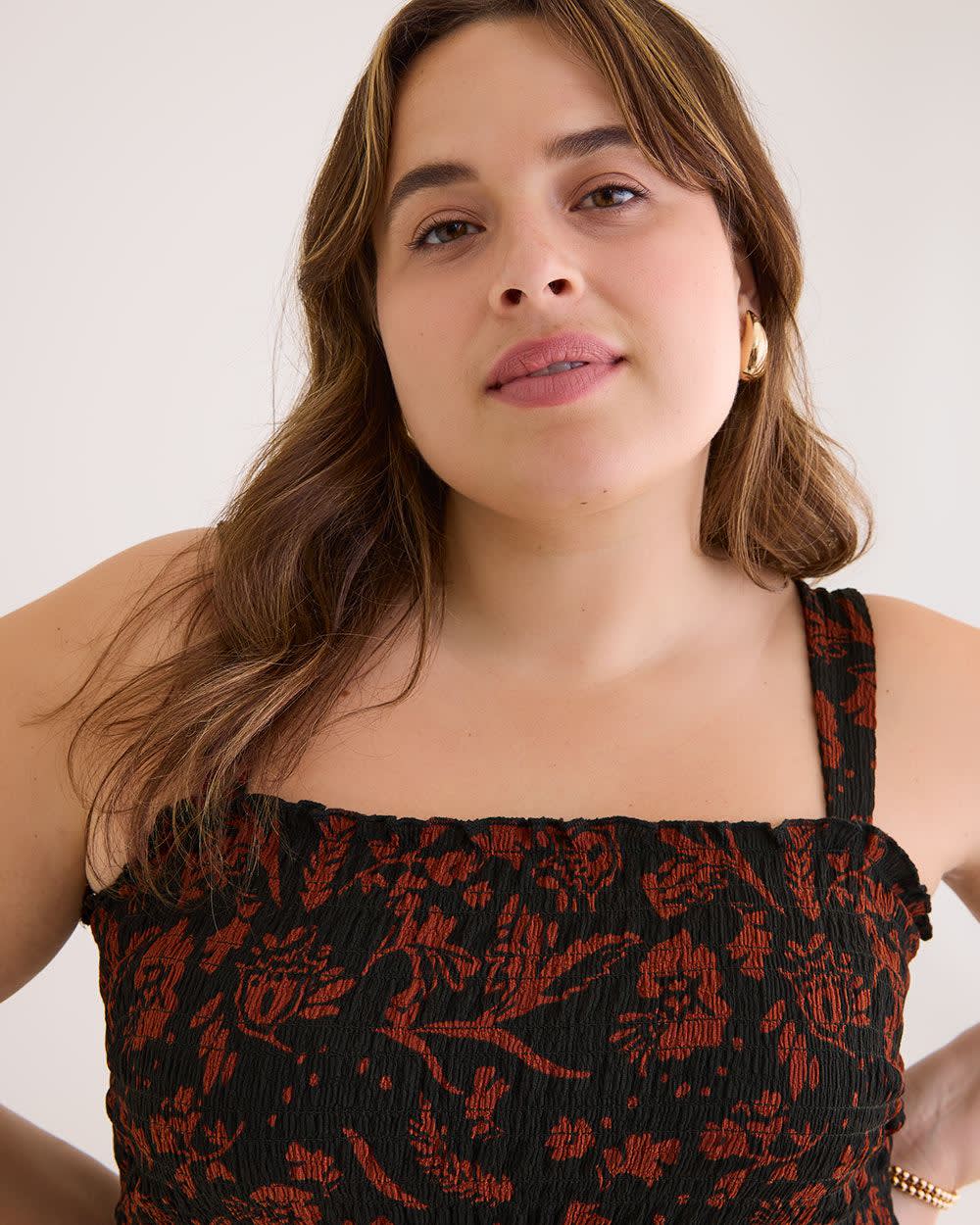 Enjoy a touch of country charm in this plus-size cami styled in a sweetly squared neckline and smocked bust. Perfect for your favourite summer looks with its large straps and fit and flare silhouette.