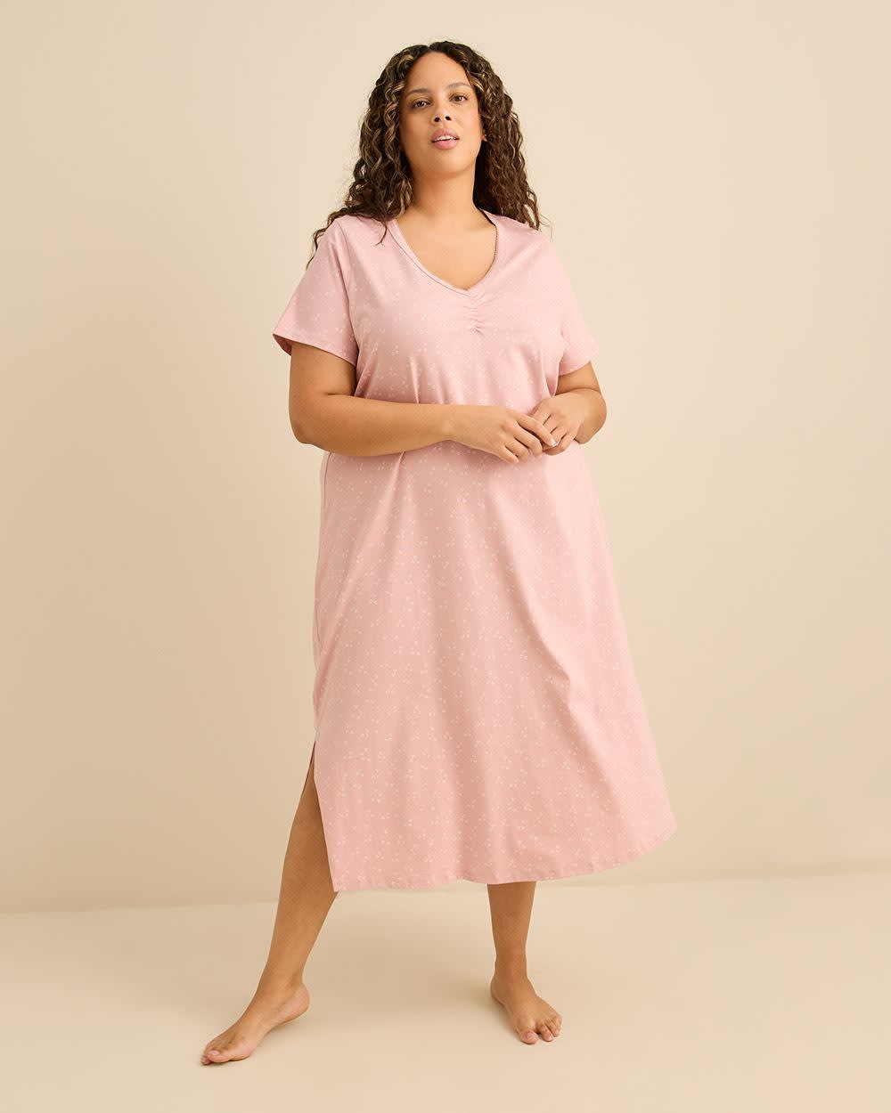 Ensuring style and comfort, as well as easy movement without feeling confined by a tight fit, this plus-size long-length sleepshirt featuring short sleeves and a V-neckline with shirring and a picot edge detail is as soft on the skin as it is cute, ideal for a great night's sleep.