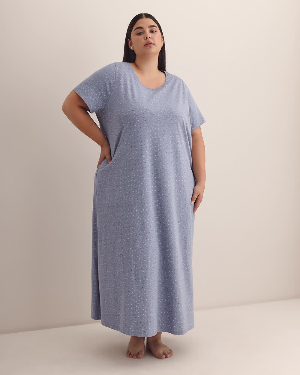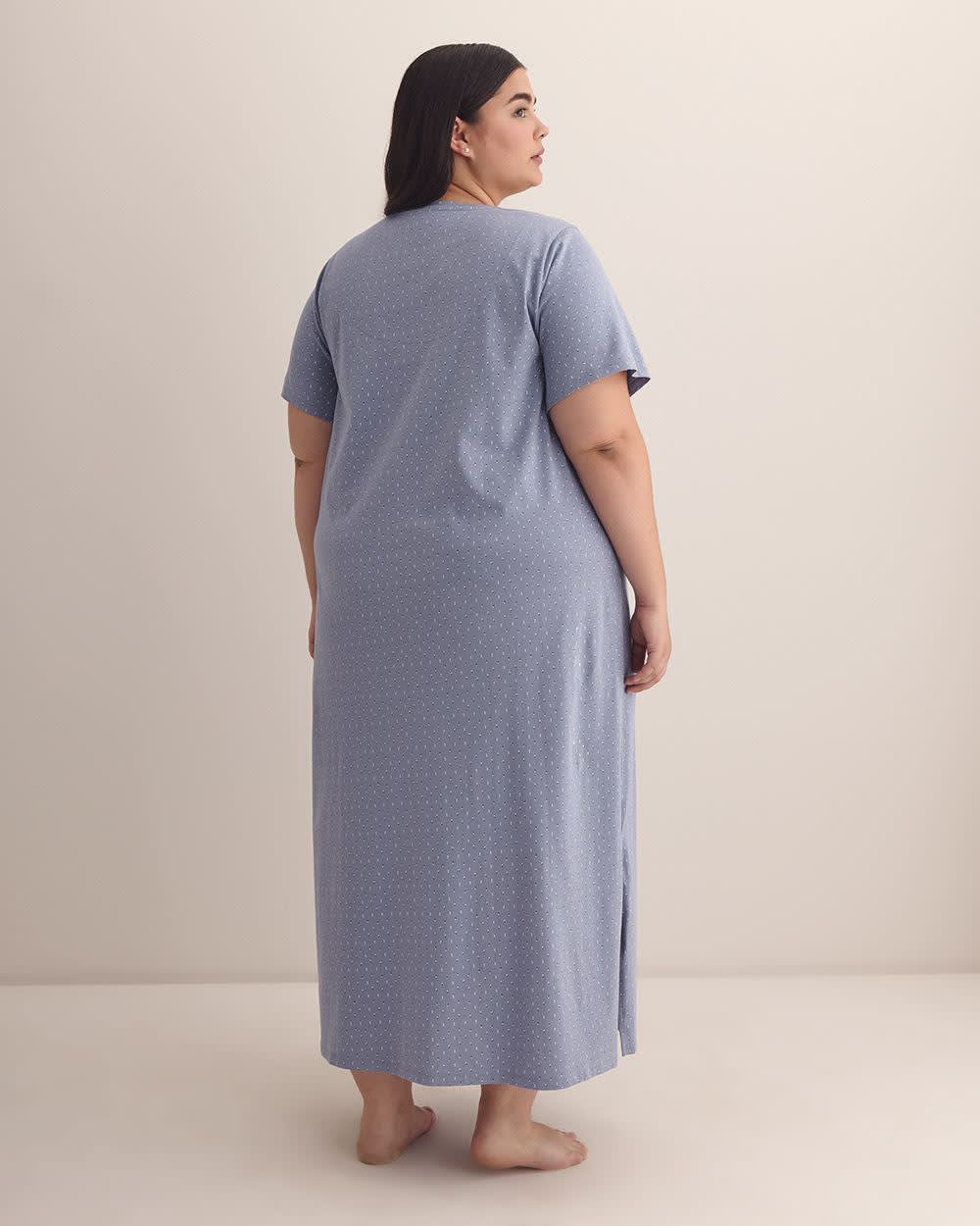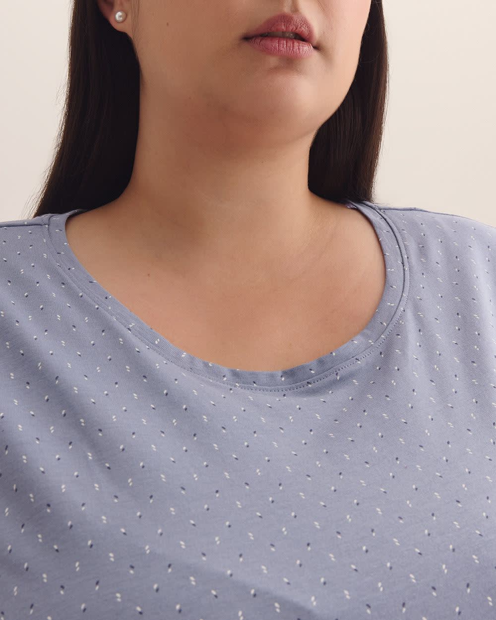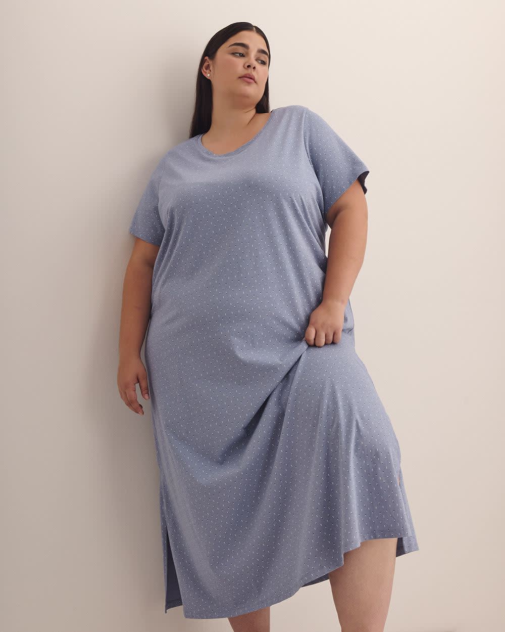 Sweet lovely dreams! This plus-size long sleepshirt made of stretch knit adorned with double dots all over is designed with a rounded neckline, short sleeves, and side slits at the hem so you can sleep comfortably and stylishly all night long.
