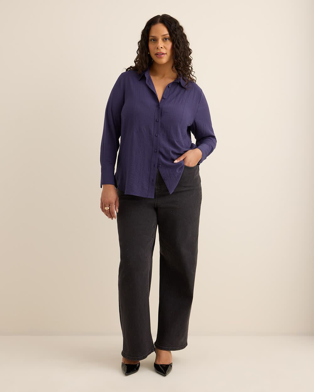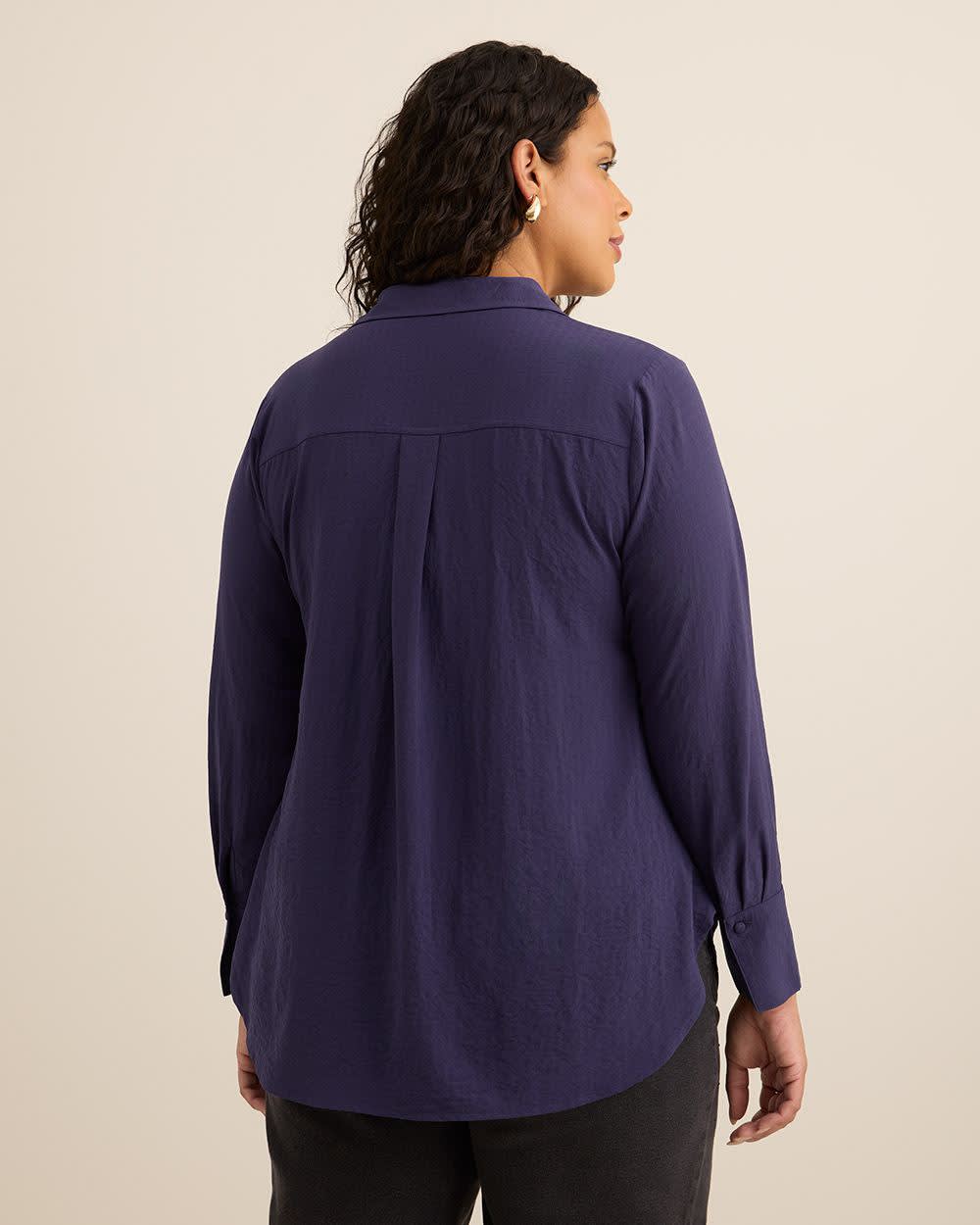 Sharp and sophisticated, this plus-size long buttoned-down shirt brings tailored elegance to your look. With a high-low hem and classic tuxedo front yoke, it's a timeless piece for effortless refinement.