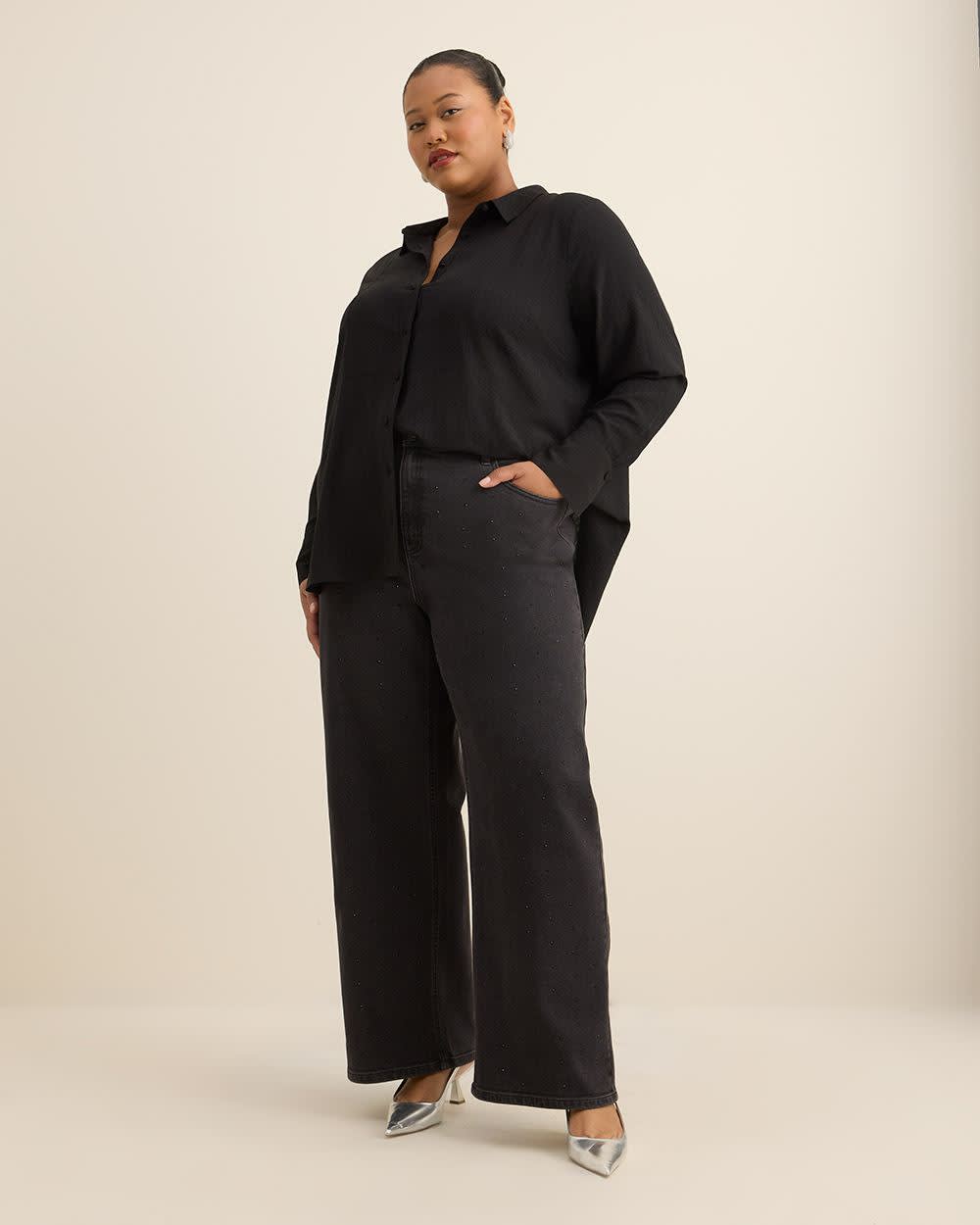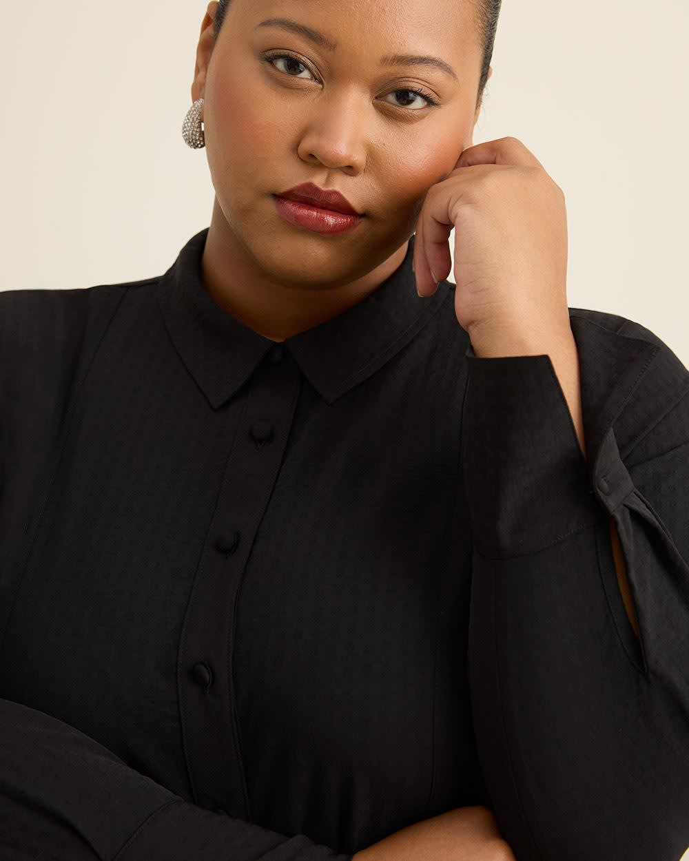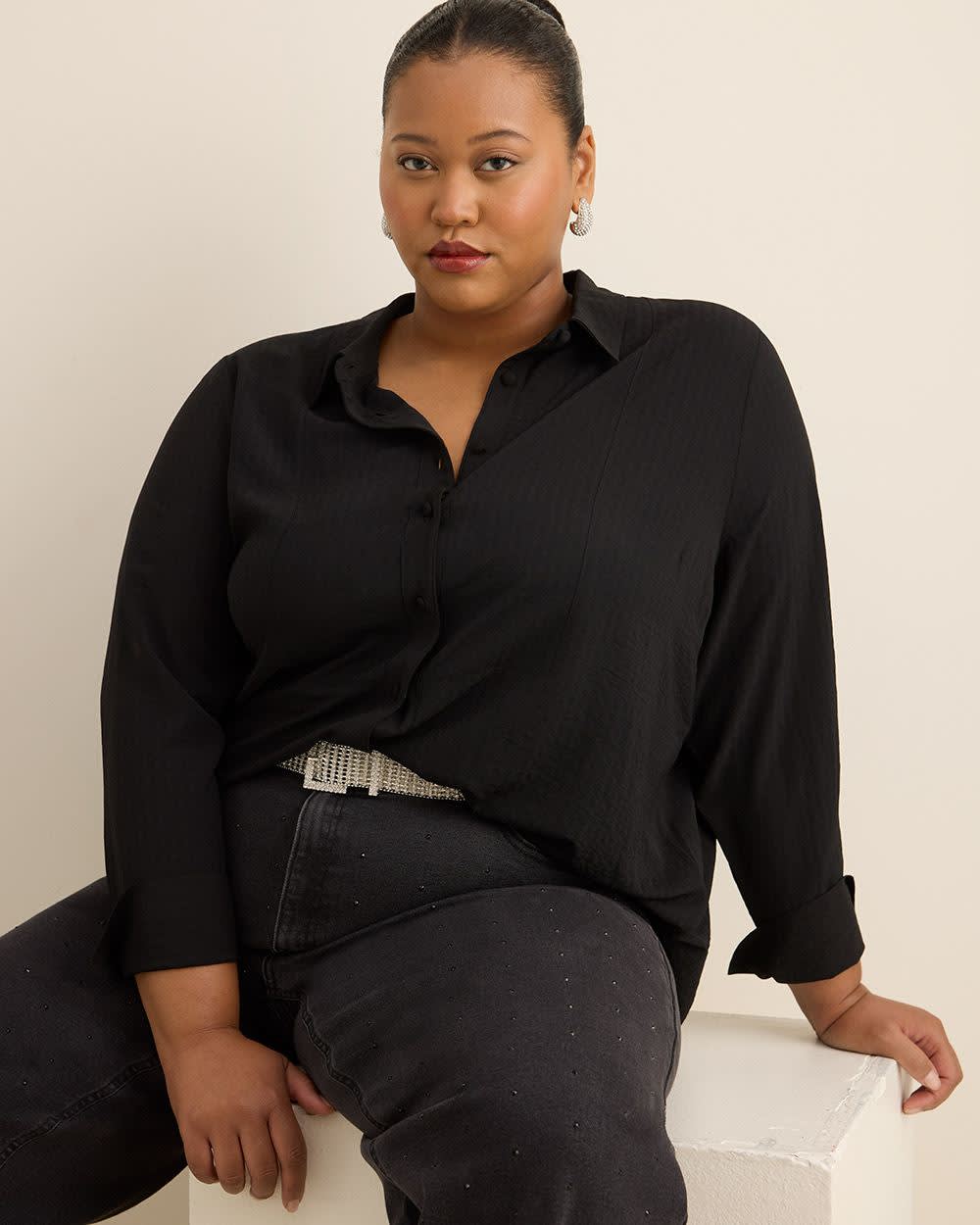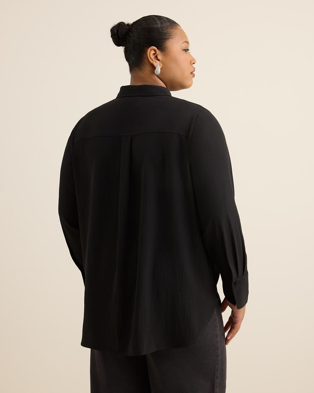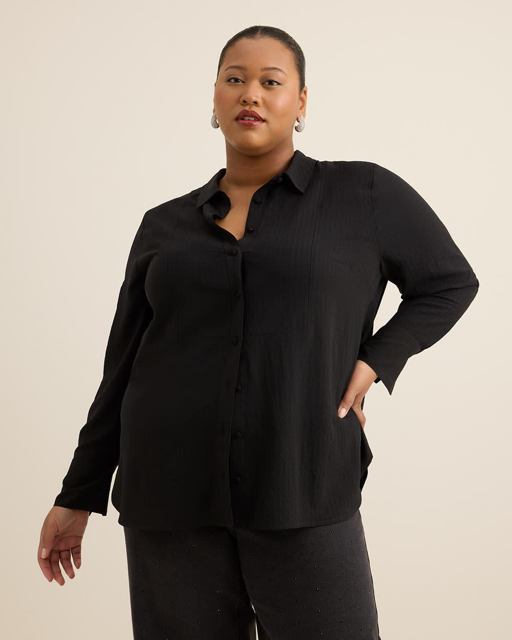 Sharp and sophisticated, this plus-size long buttoned-down shirt brings tailored elegance to your look. With a high-low hem and classic tuxedo front yoke, it's a timeless piece for effortless refinement.