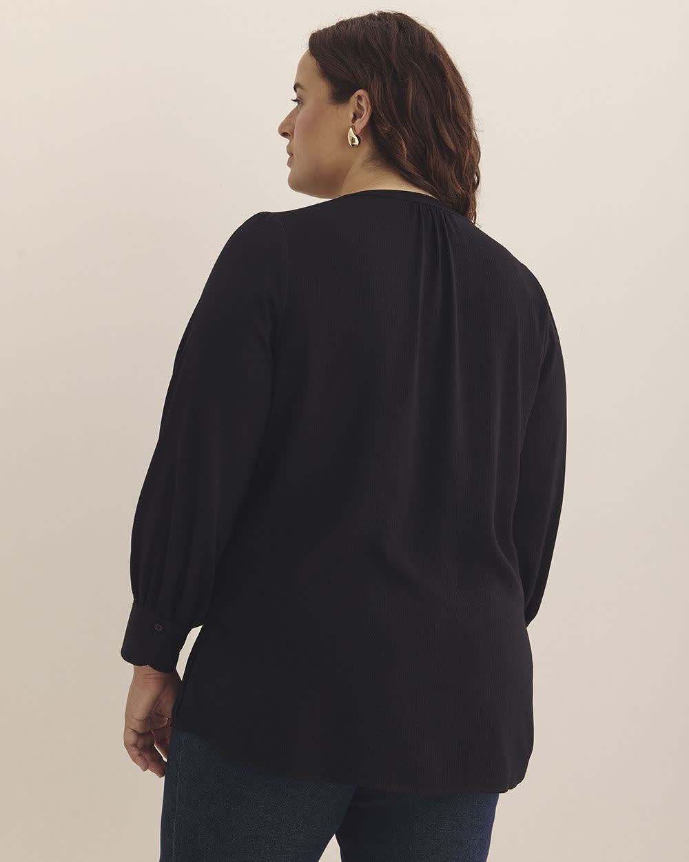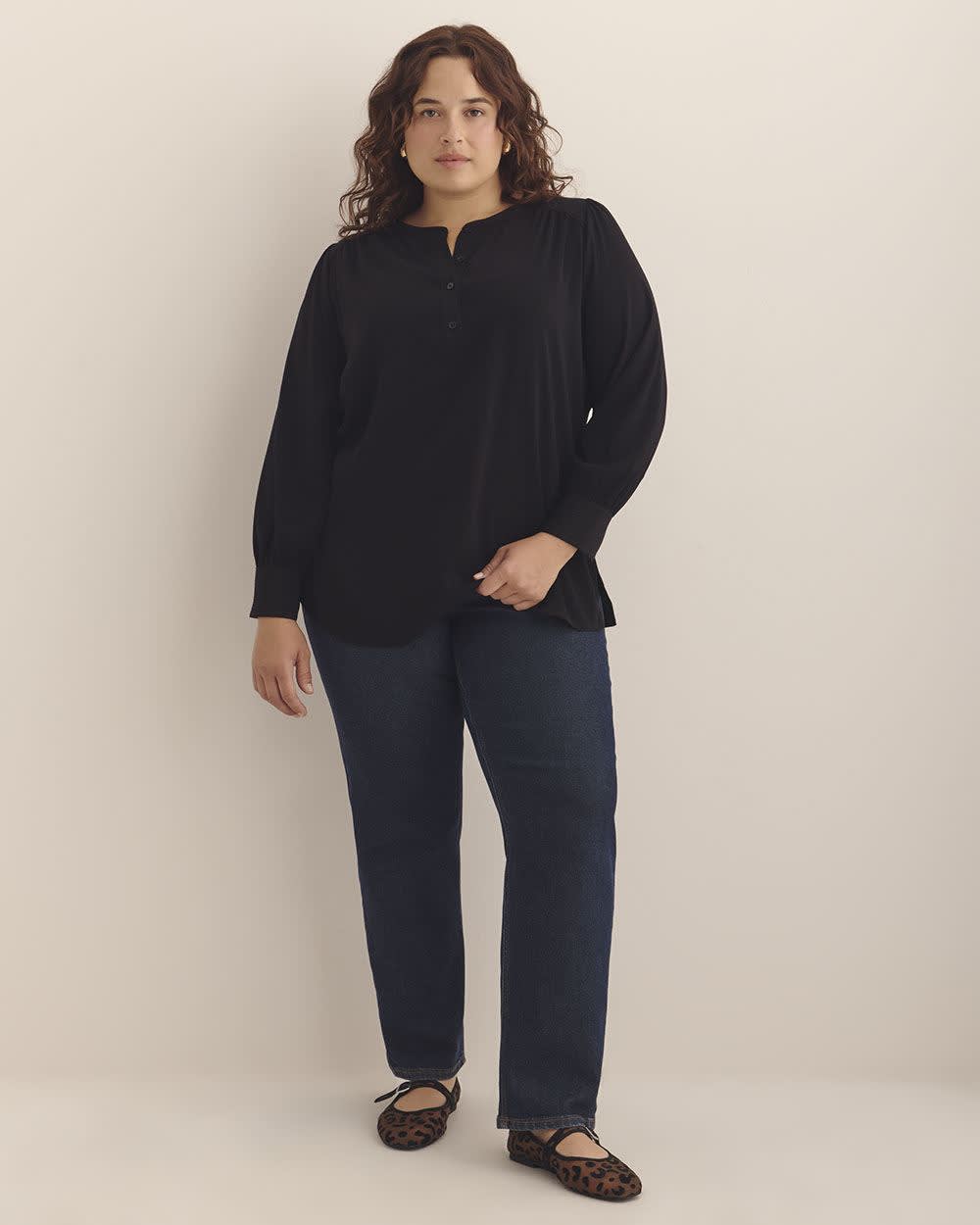 Long-Sleeve Tunic Blouse with Buttoned Crewneck